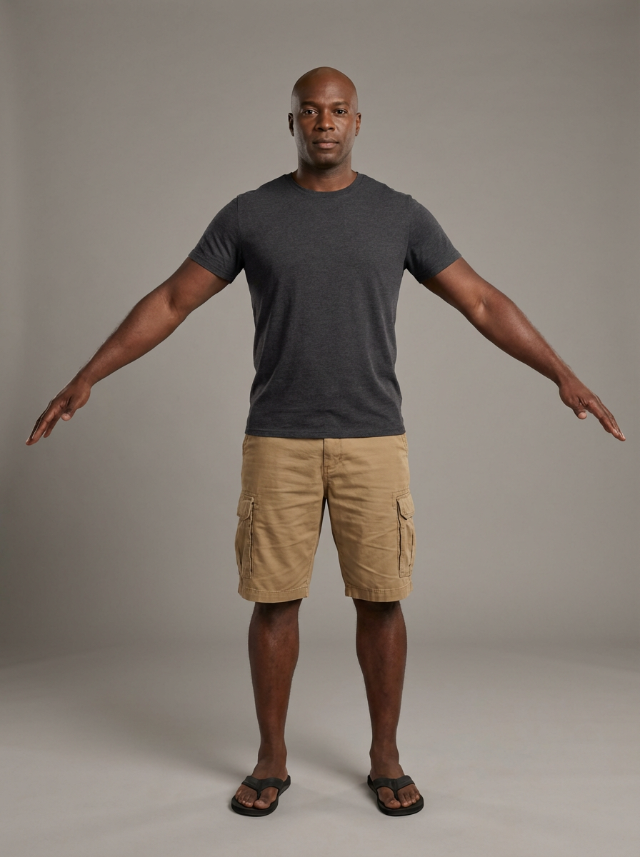 T-pose reference model, front view perspective, arms extended at shoulder height, full body shot, wearing t-shirt, cargo shorts, flip-flops, ideal for 3D character maning workflow