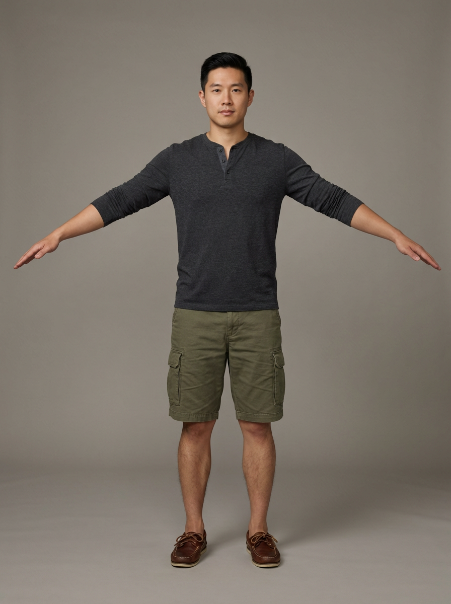 T-pose reference model, front view perspective, arms extended at shoulder height, full body shot, wearing henley shirt, shorts, boat shoes, ideal for 3D character maning workflow