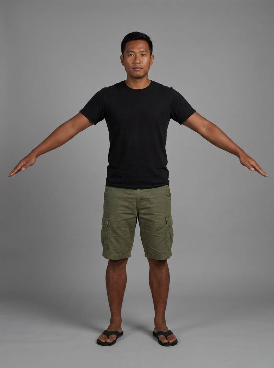 T-pose reference model, front view perspective, arms extended at shoulder height, full body shot, wearing t-shirt, cargo shorts, flip-flops, ideal for 3D character maning workflow