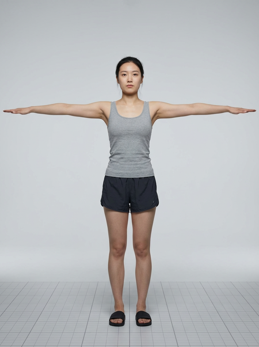 T-pose reference model, front view perspective, arms extended at shoulder height, full body shot, wearing tank top, shorts, sandals , ideal for 3D character womaning workflow