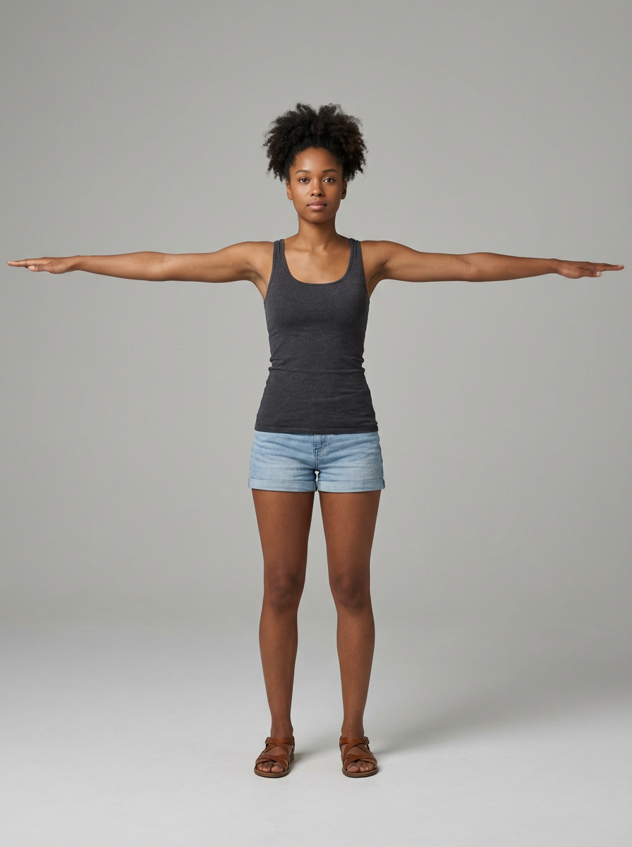 T-pose reference model, front view perspective, arms extended at shoulder height, full body shot, wearing tank top, shorts, sandals , ideal for 3D character womaning workflow