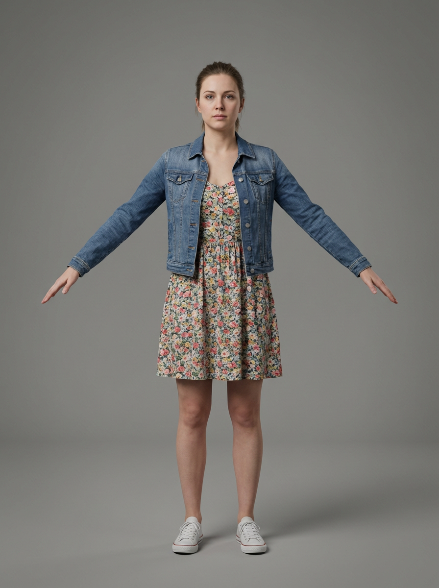 T-pose reference model, front view perspective, arms extended at shoulder height, full body shot, wearing sundress, denim jacket, canvas shoes , ideal for 3D character womaning workflow