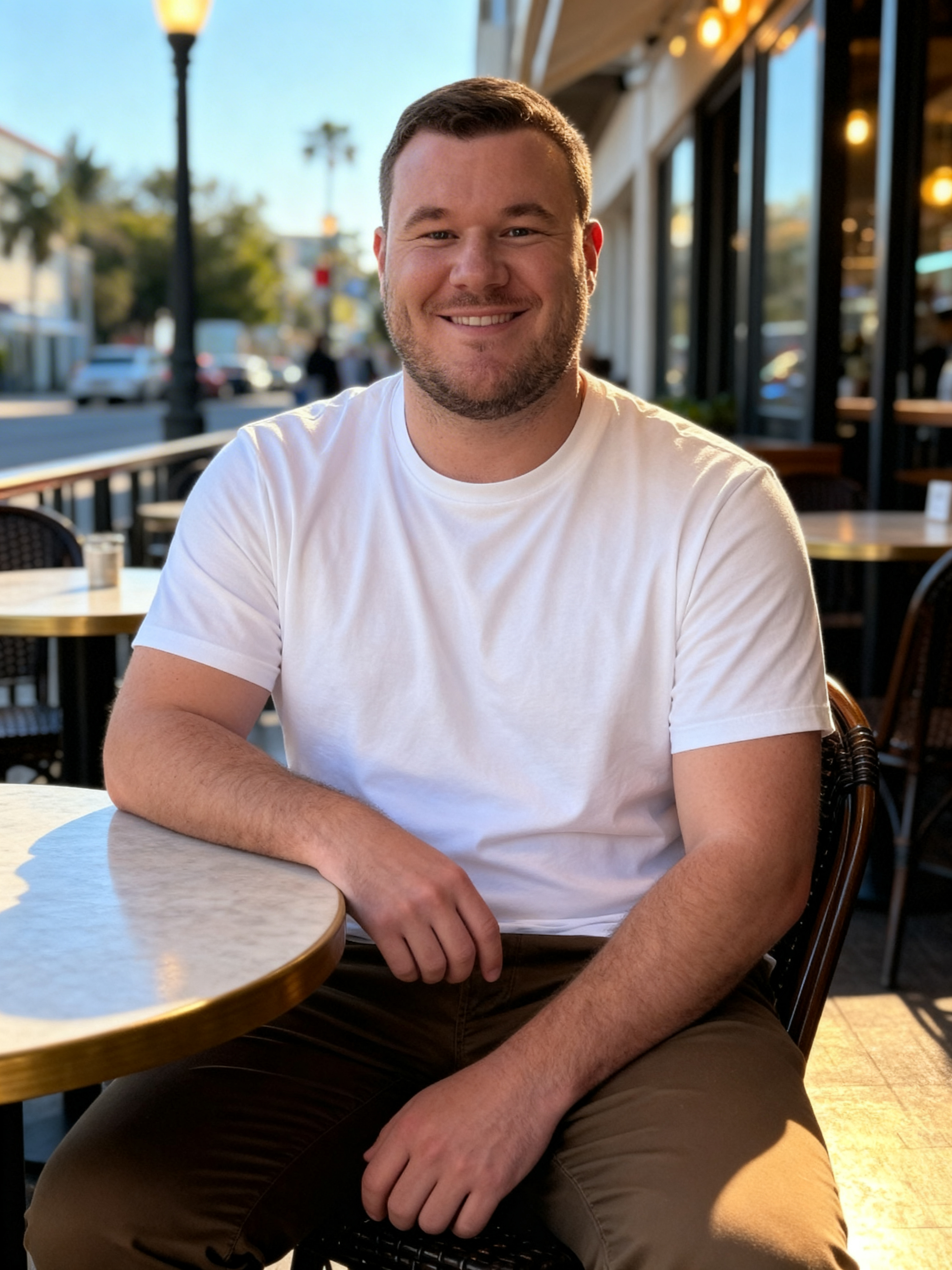 Take my model, sitting at an outdoor café, casual white t-shirt, with a confident relaxed posture, natural warm smile, calm and self-assured expression, subtle eye contact, shot by a friend, 85mm lens, professional lifestyle photography, realistic skin texture, DSLR photo