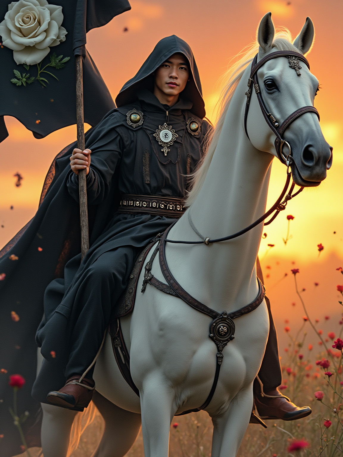 Tarot Card of Death featuring model wearing dark ceremonial robes with mystical hood and silver amulets, riding white horse, black banner with white rose, sunrise in background, transformation and renewal symbolism, mysterious but peaceful expression
