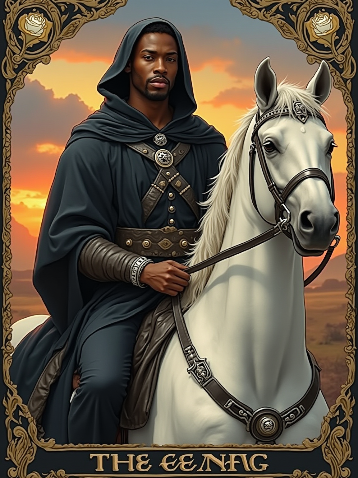 Related photosTarot Card of The Star featuring man wearing  celestial robes with star amulets and cosmic headpiece, kneeling by water, pouring water from two jugs, seven stars in night sky above, one large star prominent, hopeful serene expression, mystical landscapeTarot Card of Death featuring man wearing  dark ceremonial robes with mystical hood and silver amulets, riding white horse, black banner with white rose, sunrise in background, transformation and renewal symbolism, mysterious but peaceful expressionTarot Card of Death featuring man wearing  dark ceremonial robes with mystical hood and silver amulets, riding white horse, black banner with white rose, sunrise in background, transformation and renewal symbolism, mysterious but peaceful expressionman as a scuba diver wearing diving goggles and wearing a wetsuitheadshot of woman, sitting at a desk, at a (office), BREAK elegant blouse, pencil skirt, makeupman as a scuba diver wearing diving goggles and wearing a wetsuit