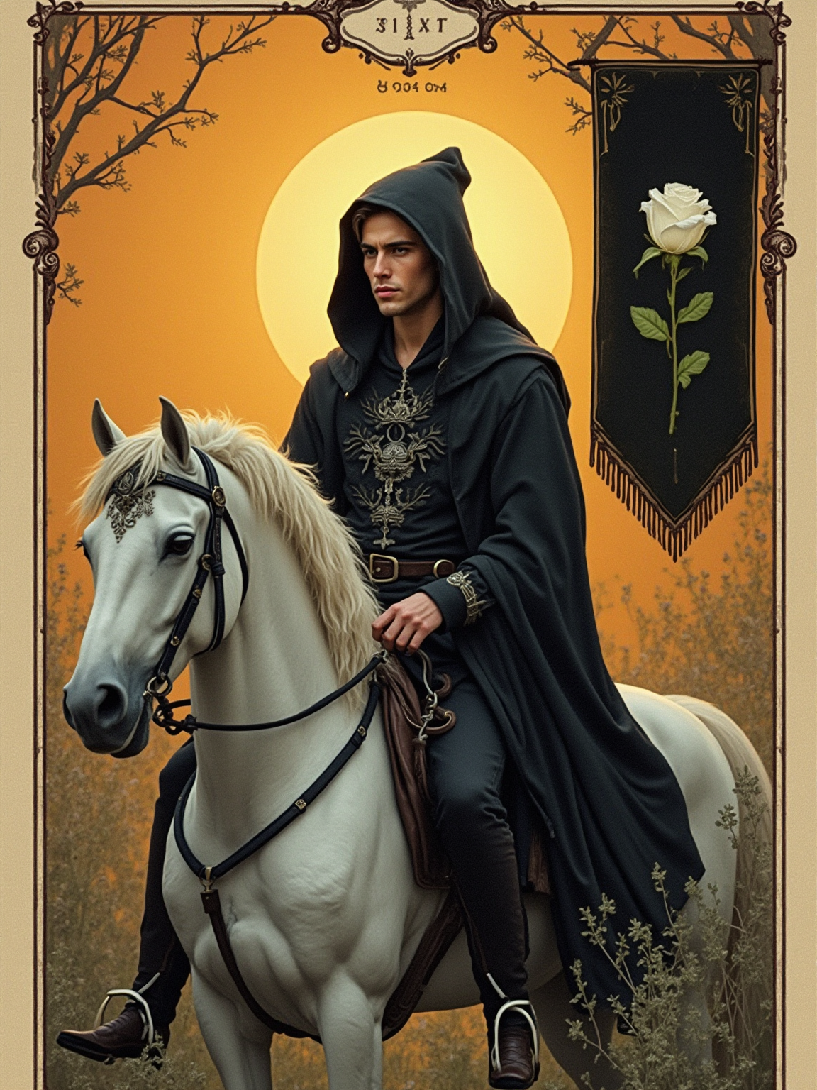 Tarot Card of Death featuring model wearing dark ceremonial robes with mystical hood and silver amulets, riding white horse, black banner with white rose, sunrise in background, transformation and renewal symbolism, mysterious but peaceful expression