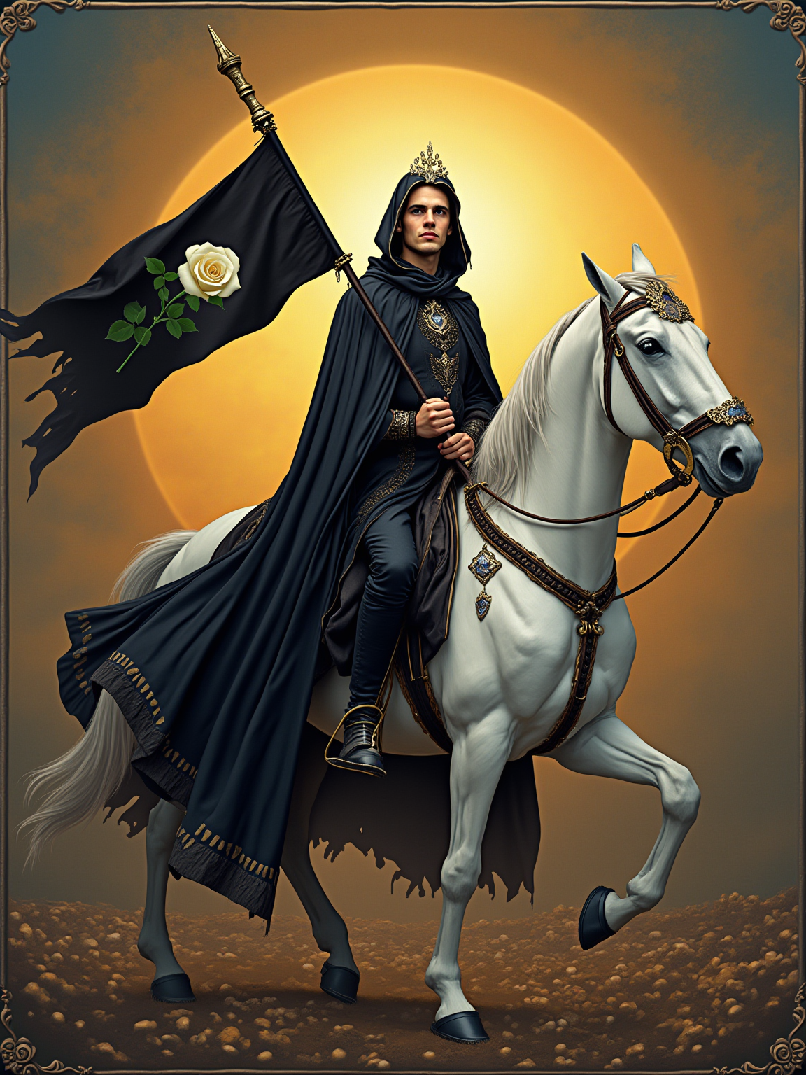 Tarot Card of Death featuring model wearing dark ceremonial robes with mystical hood and silver amulets, riding white horse, black banner with white rose, sunrise in background, transformation and renewal symbolism, mysterious but peaceful expression