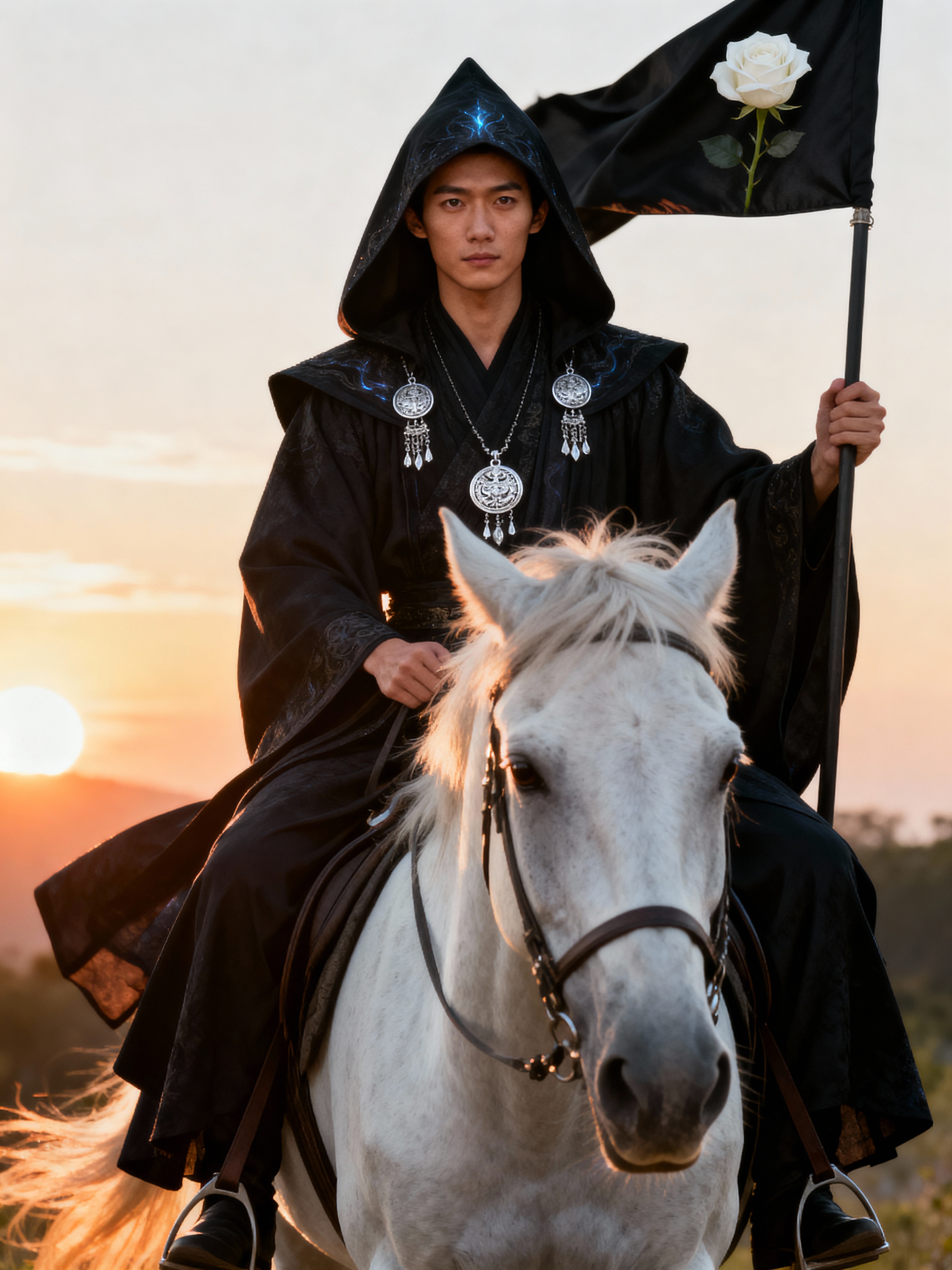 Tarot Card of Death featuring model wearing dark ceremonial robes with mystical hood and silver amulets, riding white horse, black banner with white rose, sunrise in background, transformation and renewal symbolism, mysterious but peaceful expression