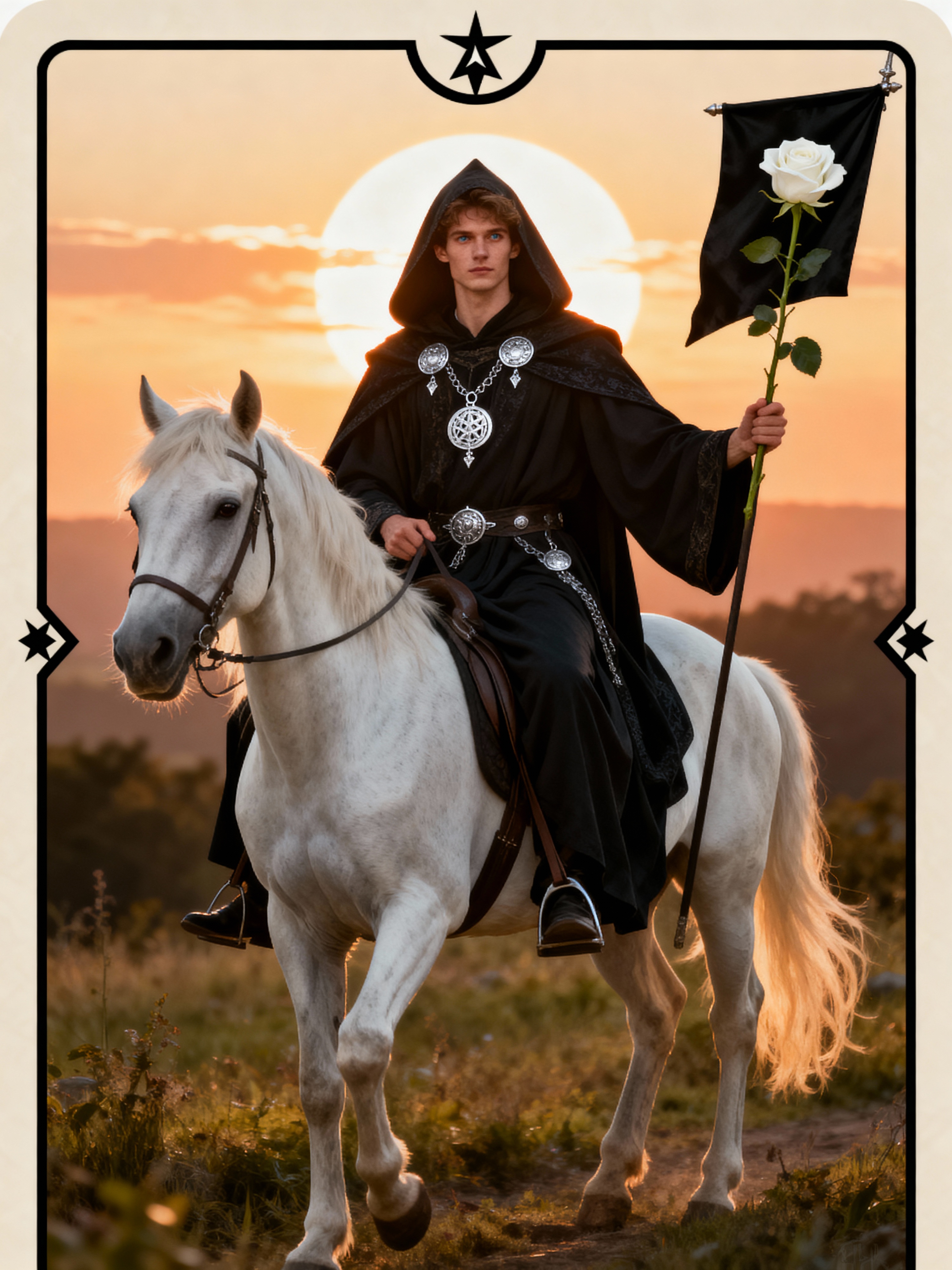 Tarot Card of Death featuring model wearing dark ceremonial robes with mystical hood and silver amulets, riding white horse, black banner with white rose, sunrise in background, transformation and renewal symbolism, mysterious but peaceful expression