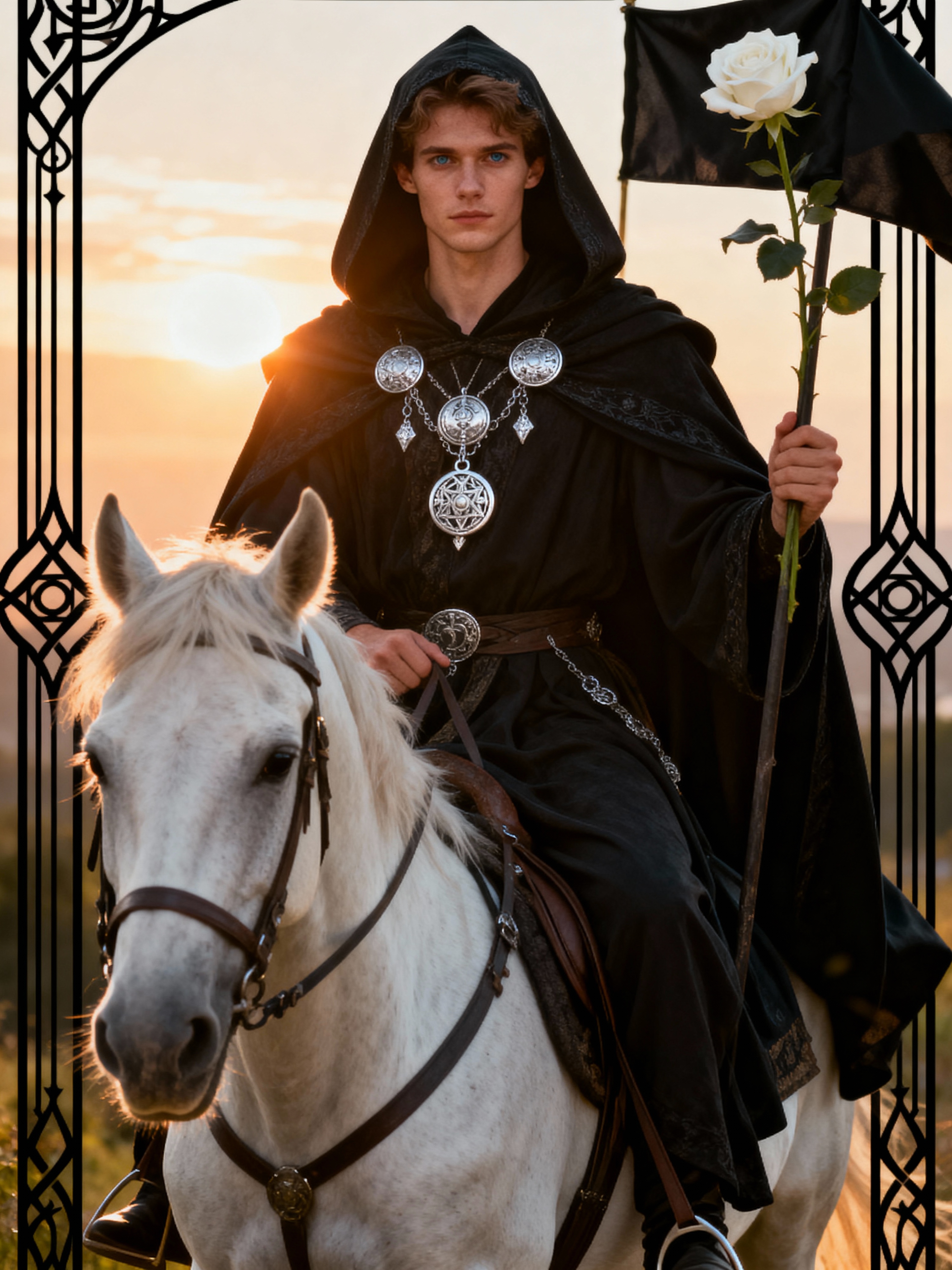 Tarot Card of Death featuring model wearing dark ceremonial robes with mystical hood and silver amulets, riding white horse, black banner with white rose, sunrise in background, transformation and renewal symbolism, mysterious but peaceful expression