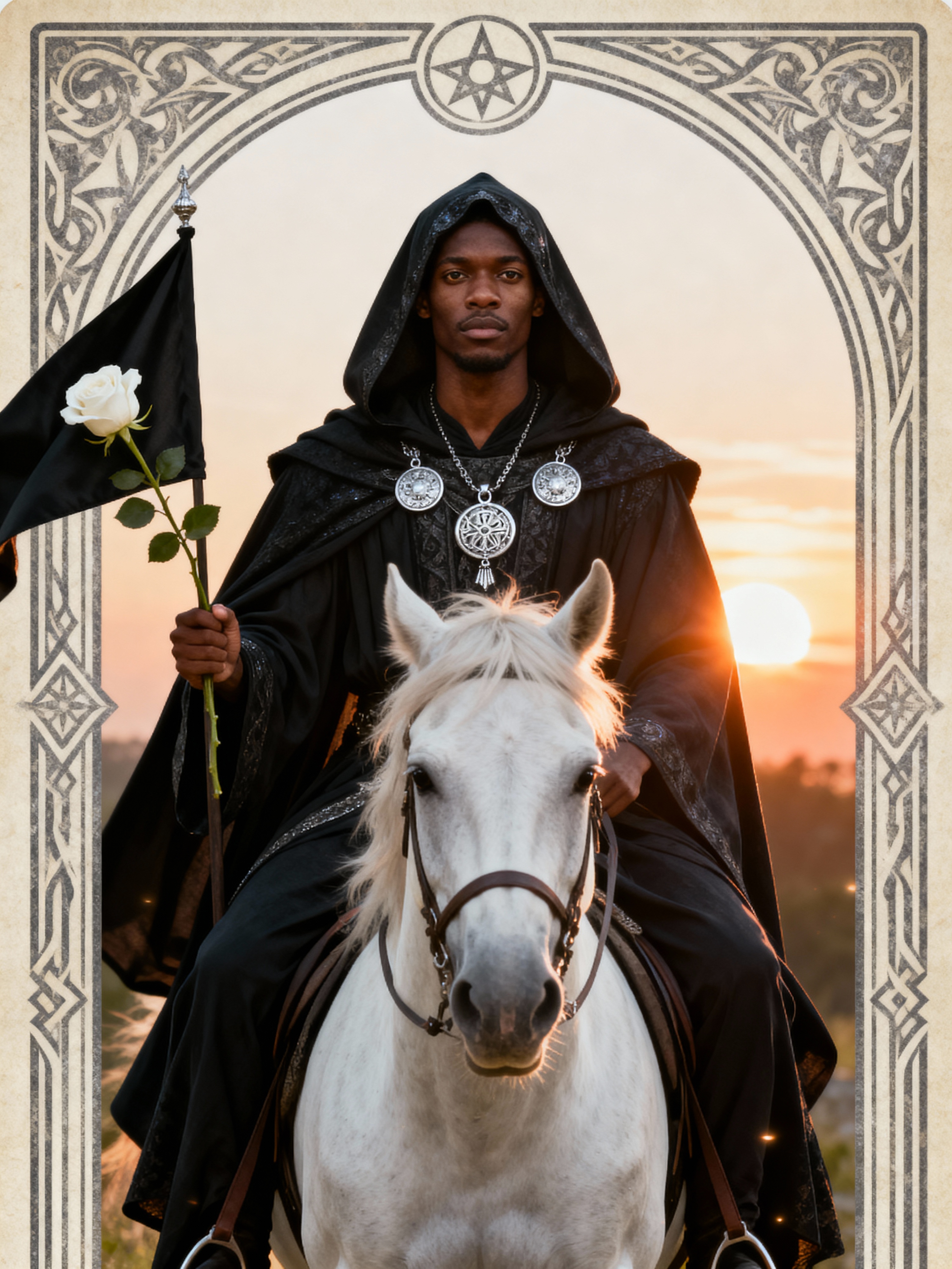 Tarot Card of Death featuring model wearing dark ceremonial robes with mystical hood and silver amulets, riding white horse, black banner with white rose, sunrise in background, transformation and renewal symbolism, mysterious but peaceful expression