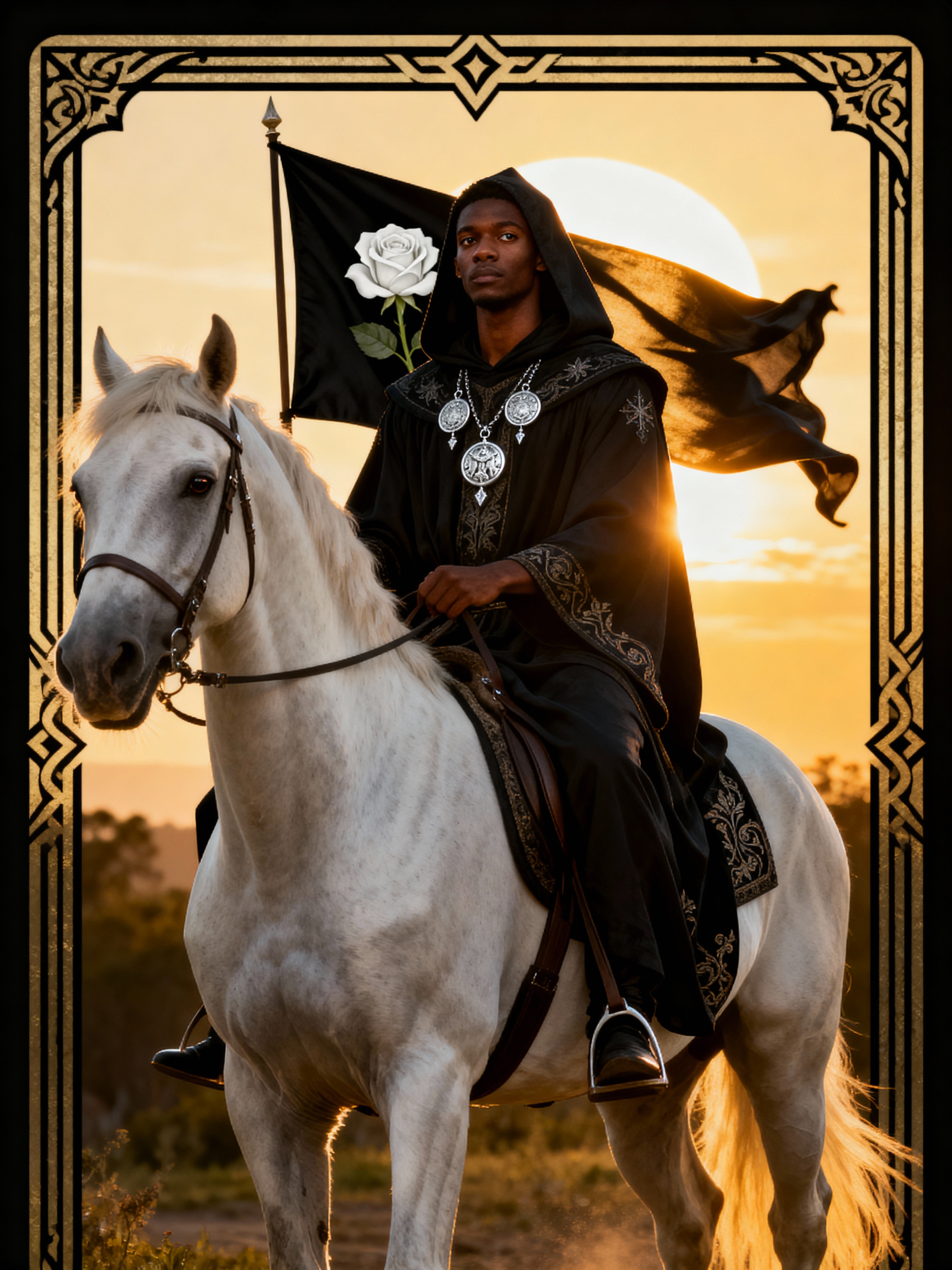 Tarot Card of Death featuring model wearing dark ceremonial robes with mystical hood and silver amulets, riding white horse, black banner with white rose, sunrise in background, transformation and renewal symbolism, mysterious but peaceful expression