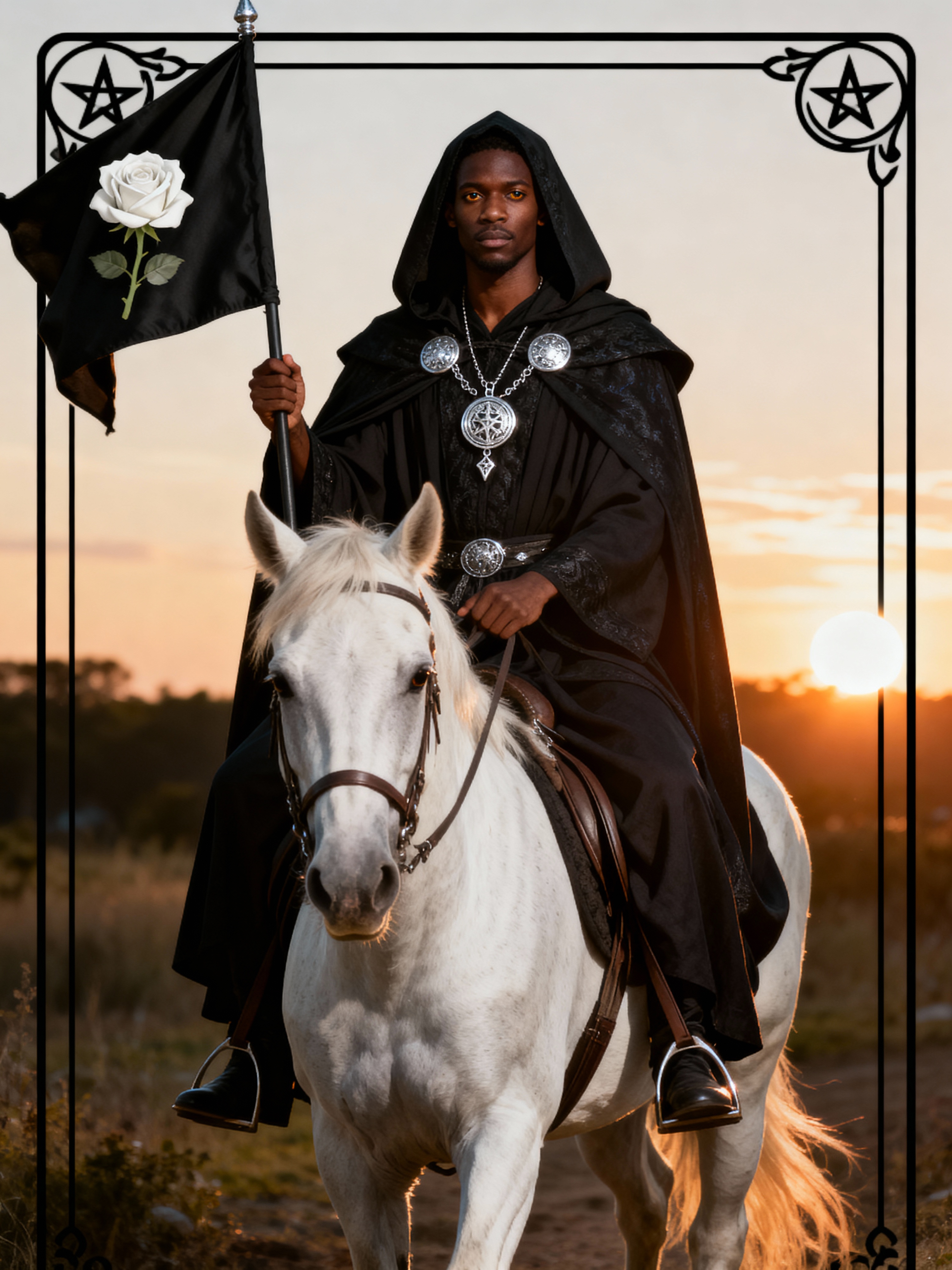 Tarot Card of Death featuring model wearing dark ceremonial robes with mystical hood and silver amulets, riding white horse, black banner with white rose, sunrise in background, transformation and renewal symbolism, mysterious but peaceful expression