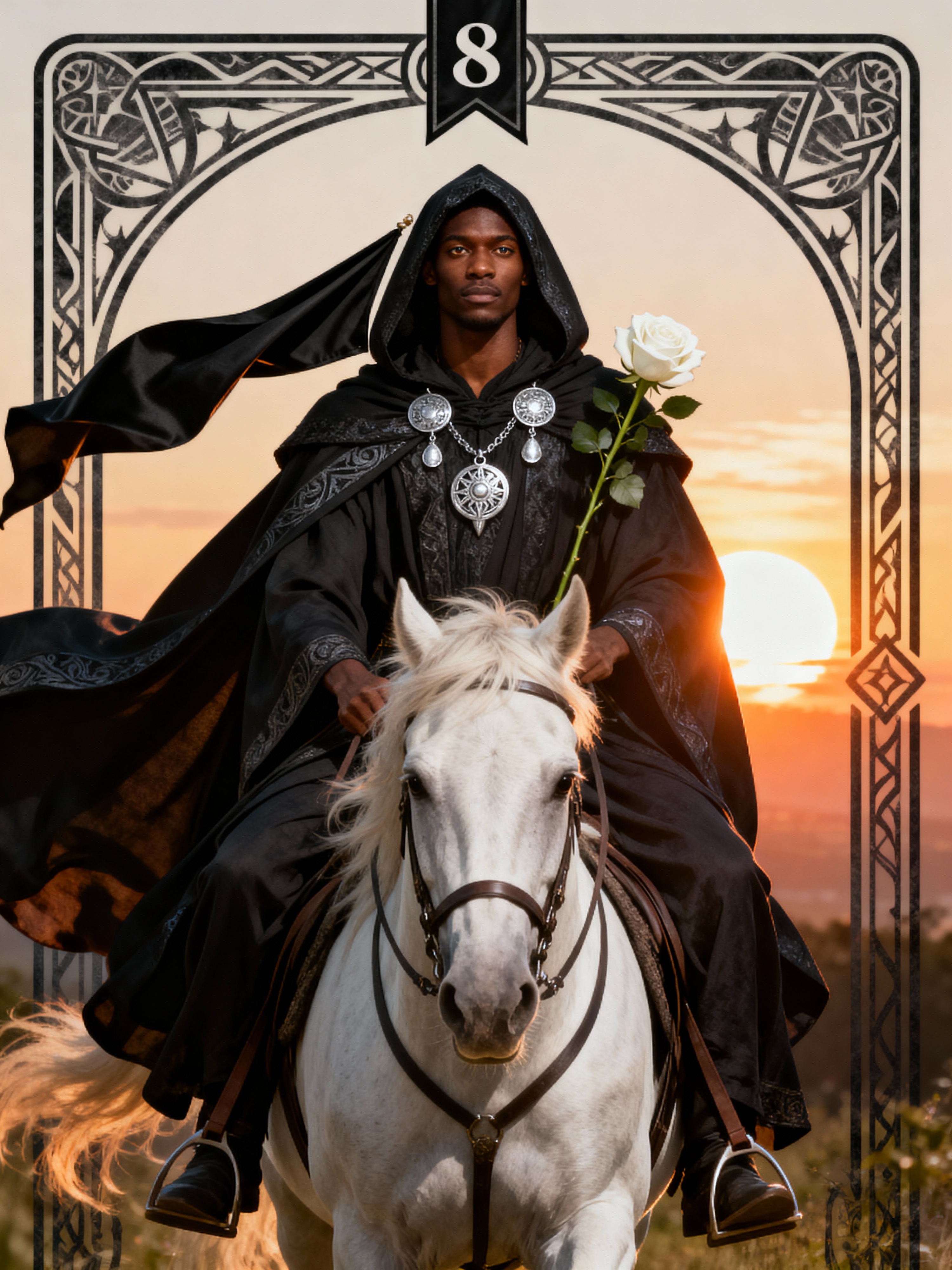Tarot Card of Death featuring model wearing dark ceremonial robes with mystical hood and silver amulets, riding white horse, black banner with white rose, sunrise in background, transformation and renewal symbolism, mysterious but peaceful expression