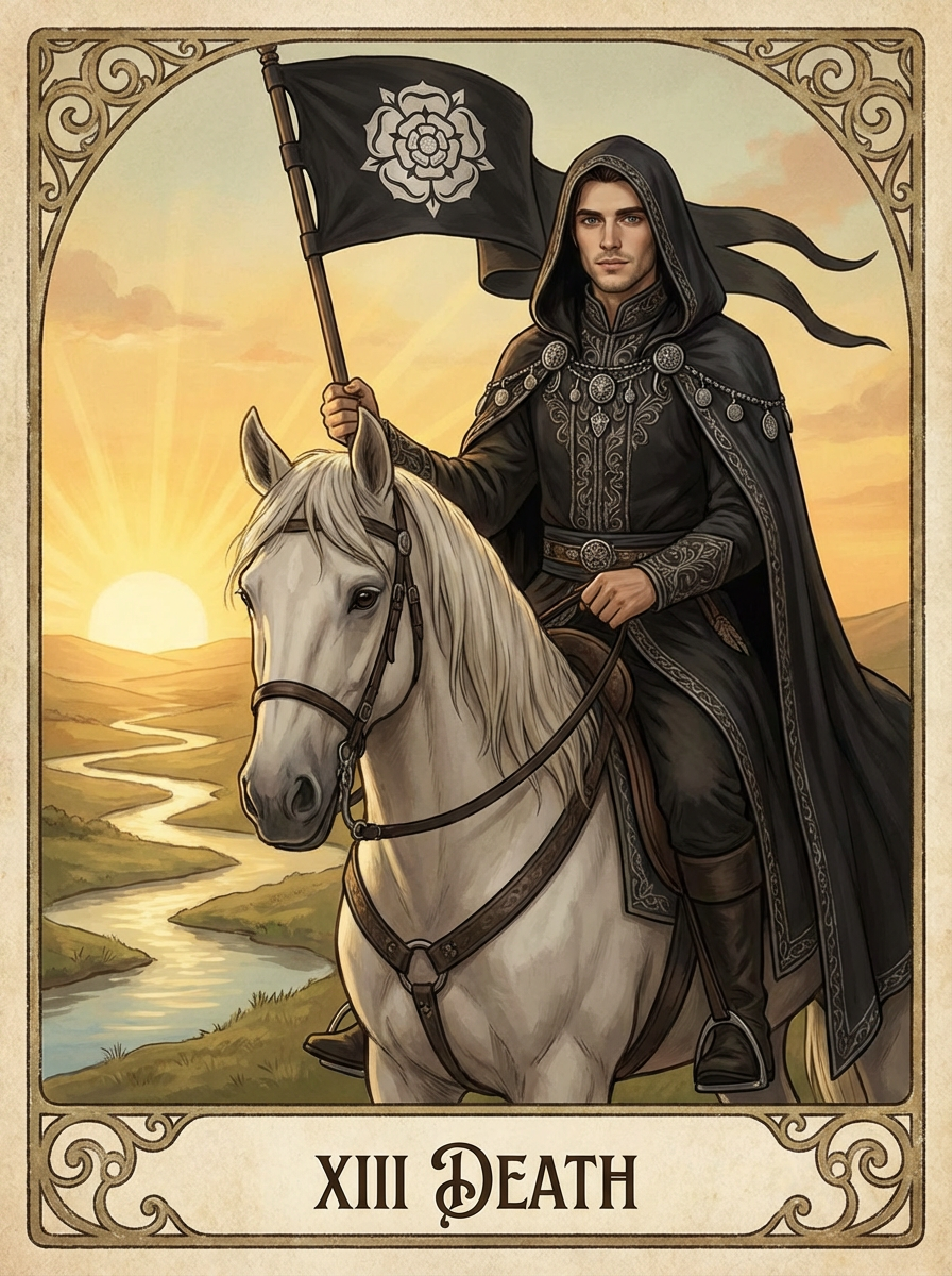 Tarot Card of Death featuring model wearing dark ceremonial robes with mystical hood and silver amulets, riding white horse, black banner with white rose, sunrise in background, transformation and renewal symbolism, mysterious but peaceful expression
