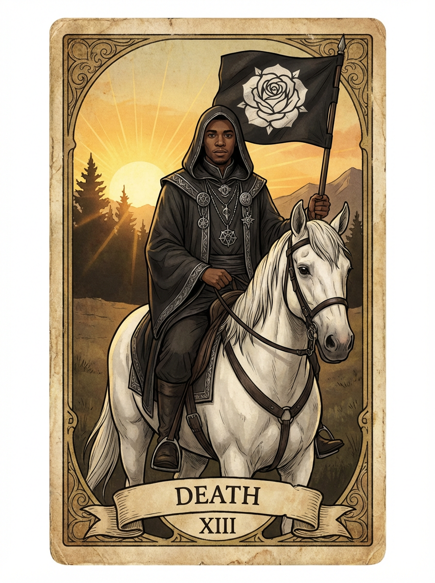 Tarot Card of Death featuring model wearing dark ceremonial robes with mystical hood and silver amulets, riding white horse, black banner with white rose, sunrise in background, transformation and renewal symbolism, mysterious but peaceful expression