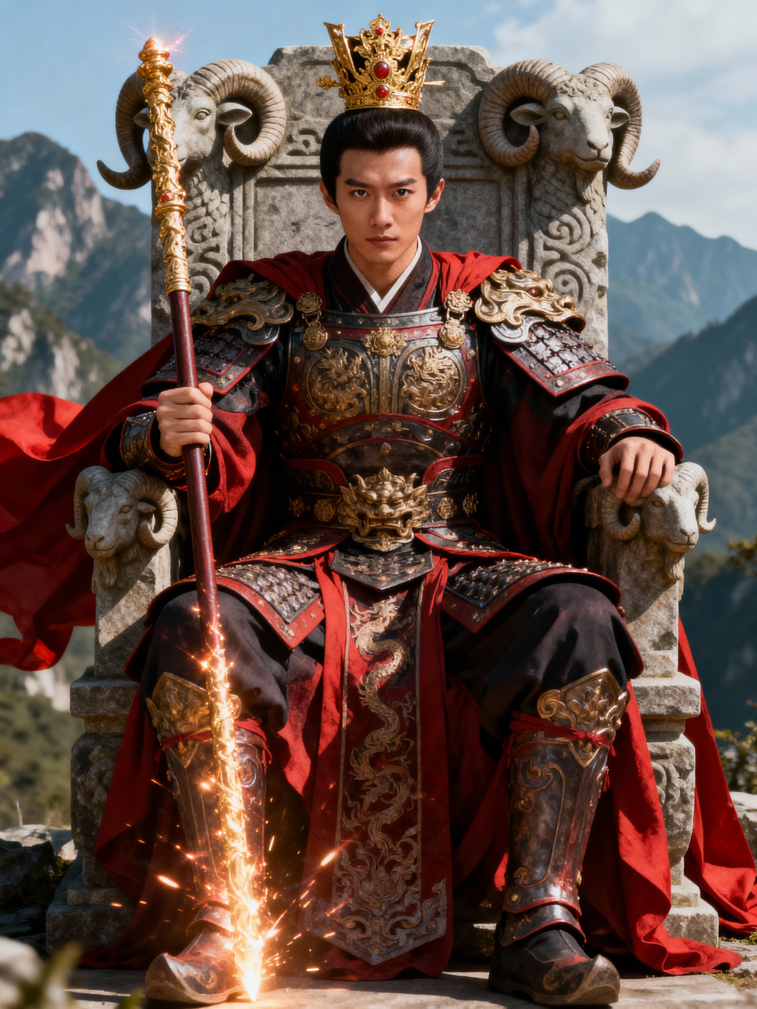 Tarot Card of The Emperor featuring model wearing ornate armor with golden crown and royal scepter, seated on stone throne with ram head carvings, red robes, mountain landscape background, authoritative powerful expression, symbols of leadership