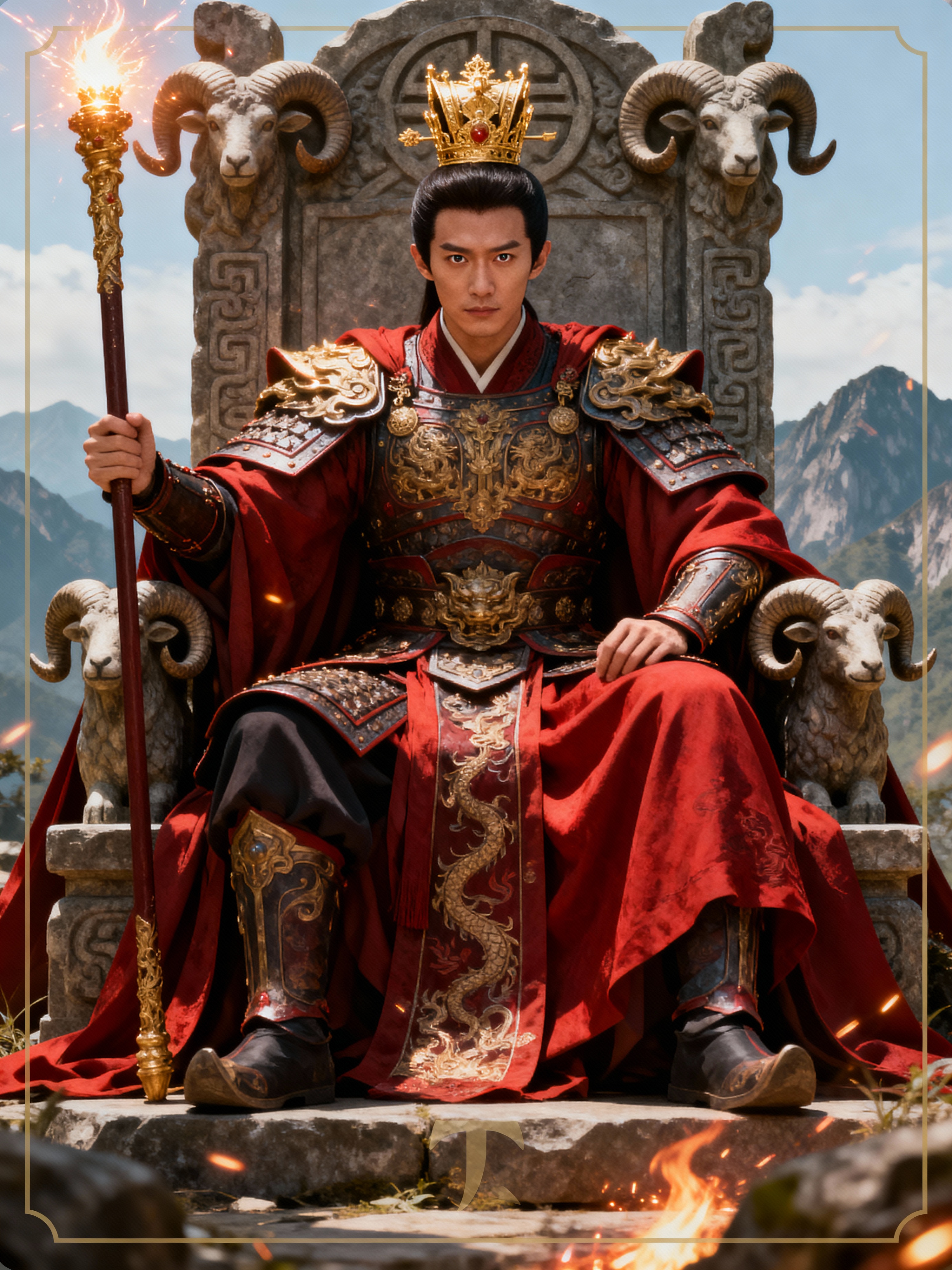 Tarot Card of The Emperor featuring model wearing ornate armor with golden crown and royal scepter, seated on stone throne with ram head carvings, red robes, mountain landscape background, authoritative powerful expression, symbols of leadership
