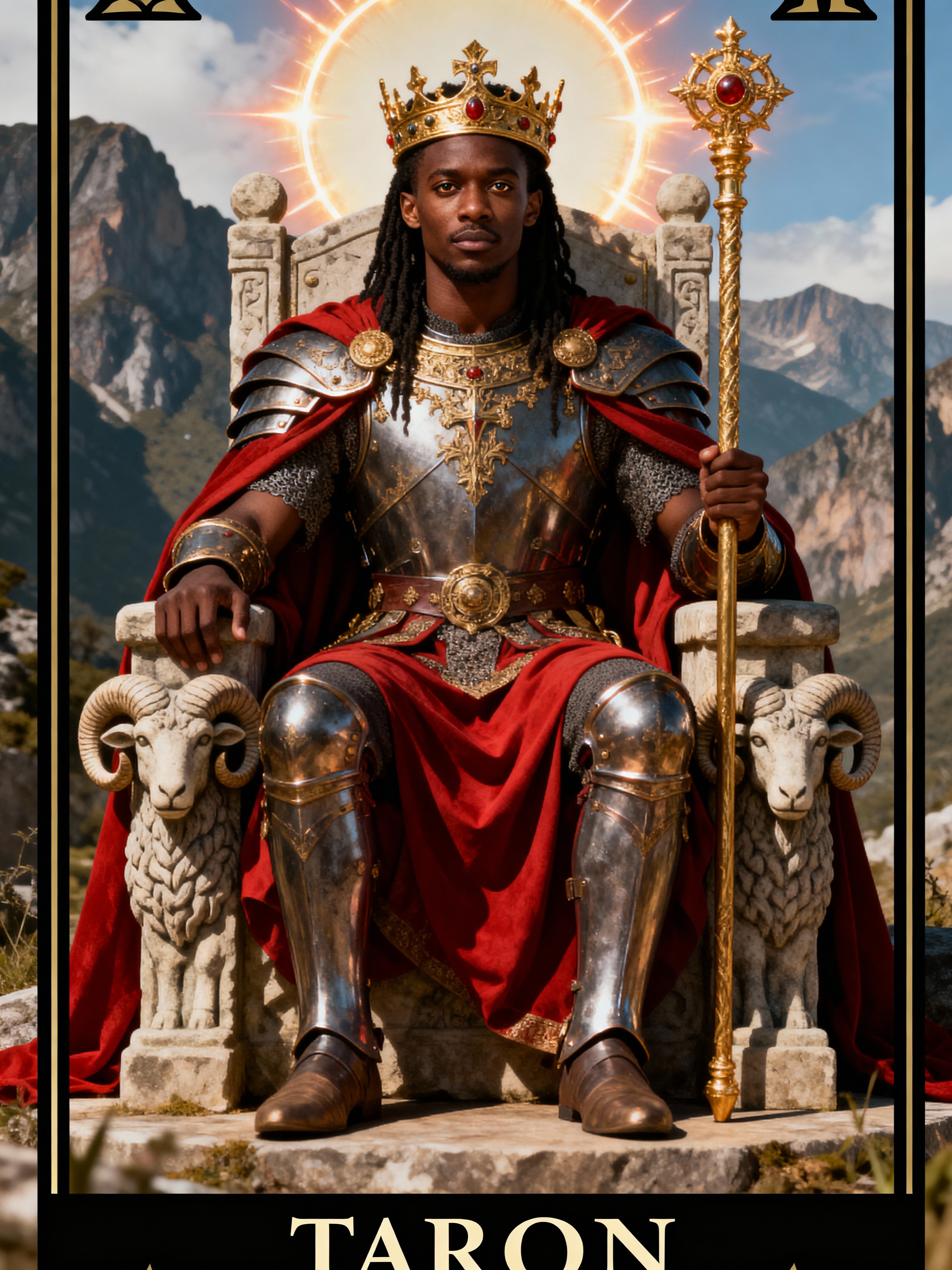 Tarot Card of The Emperor featuring model wearing ornate armor with golden crown and royal scepter, seated on stone throne with ram head carvings, red robes, mountain landscape background, authoritative powerful expression, symbols of leadership