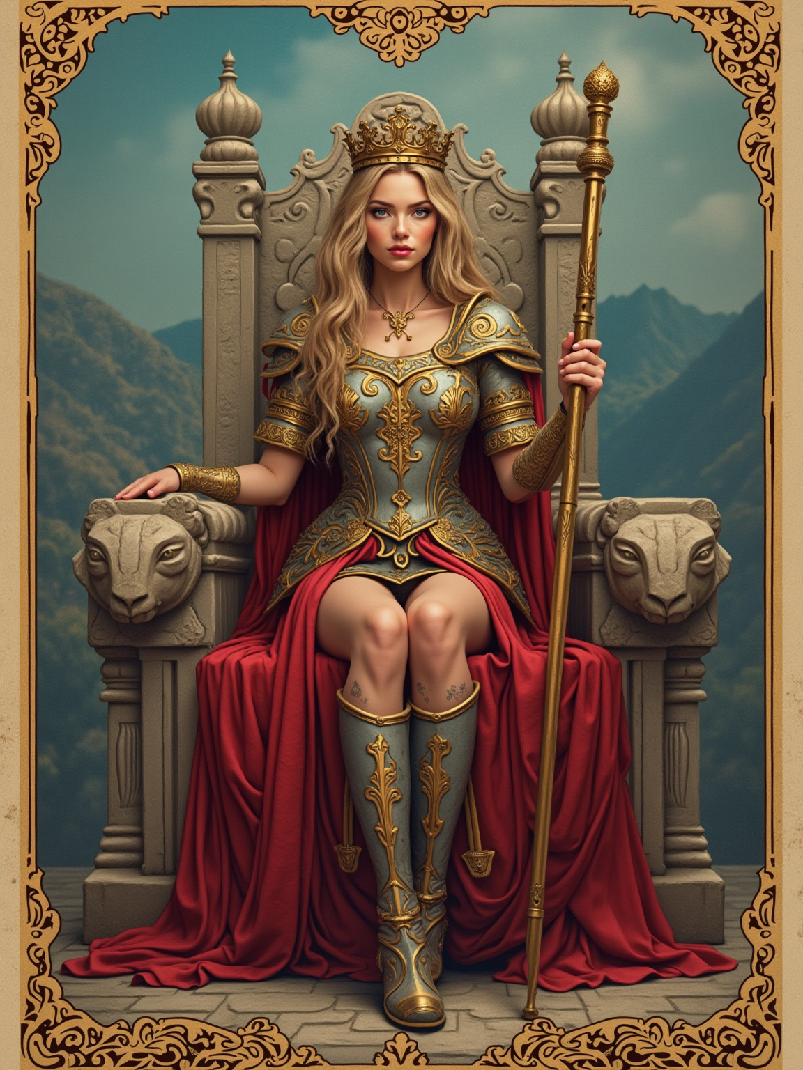 Tarot Card of The Emperor featuring model wearing regal armor-inspired dress with golden crown and royal scepter , seated on stone throne with ram head carvings, red robes, mountain landscape background, authoritative powerful expression, symbols of leadership