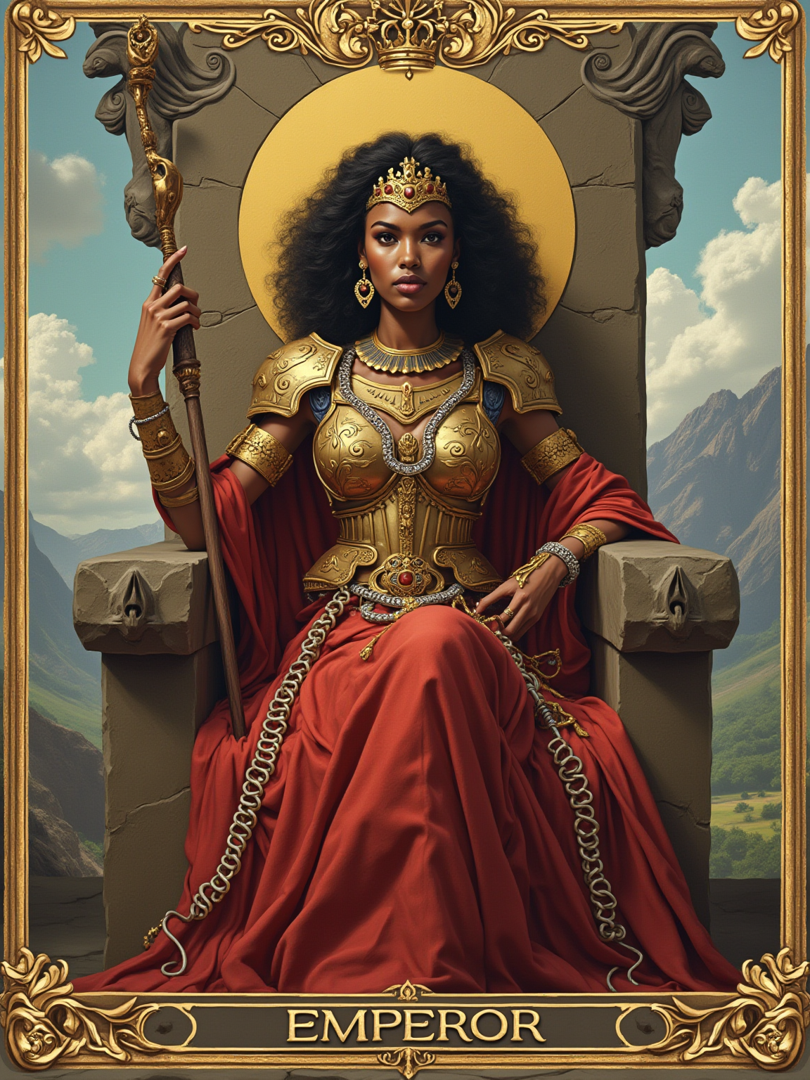Tarot Card of The Emperor featuring model wearing regal armor-inspired dress with golden crown and royal scepter , seated on stone throne with ram head carvings, red robes, mountain landscape background, authoritative powerful expression, symbols of leadership