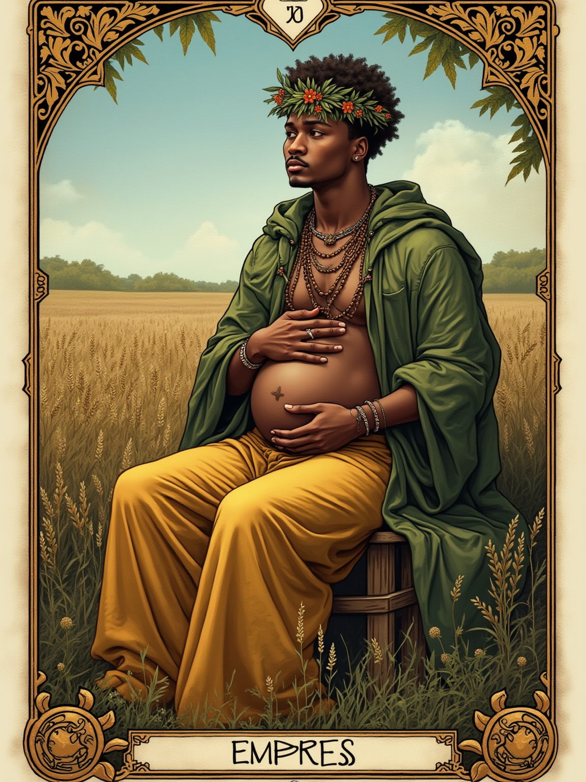 Tarot Card of The Empress featuring model wearing nature-inspired robes with leaf crown and earth-toned jewelry, seated in lush garden setting, wheat field background, Venus symbol on shield, pregnant or nurturing pose, abundant natural beauty