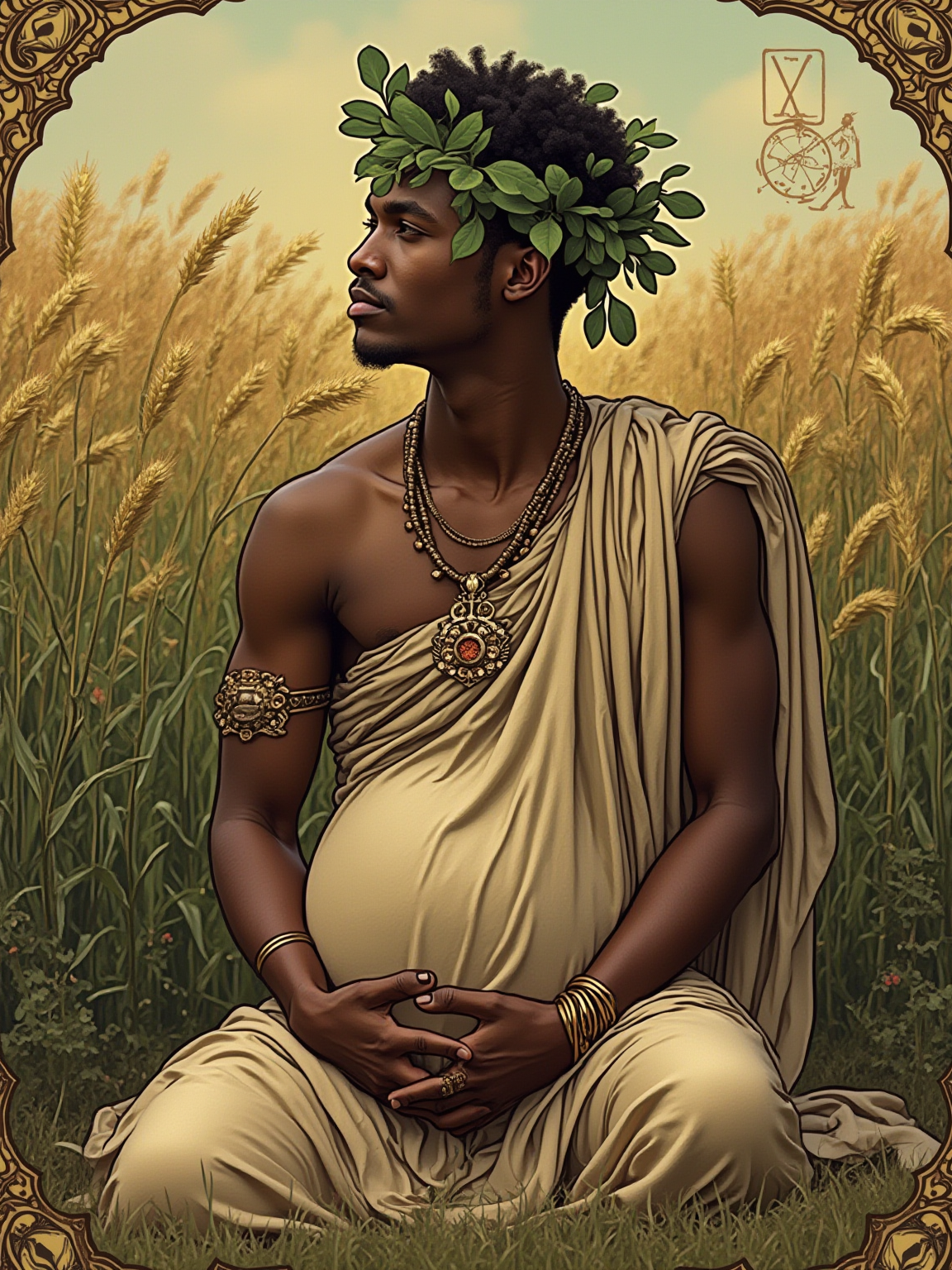 Tarot Card of The Empress featuring model wearing nature-inspired robes with leaf crown and earth-toned jewelry, seated in lush garden setting, wheat field background, Venus symbol on shield, pregnant or nurturing pose, abundant natural beauty