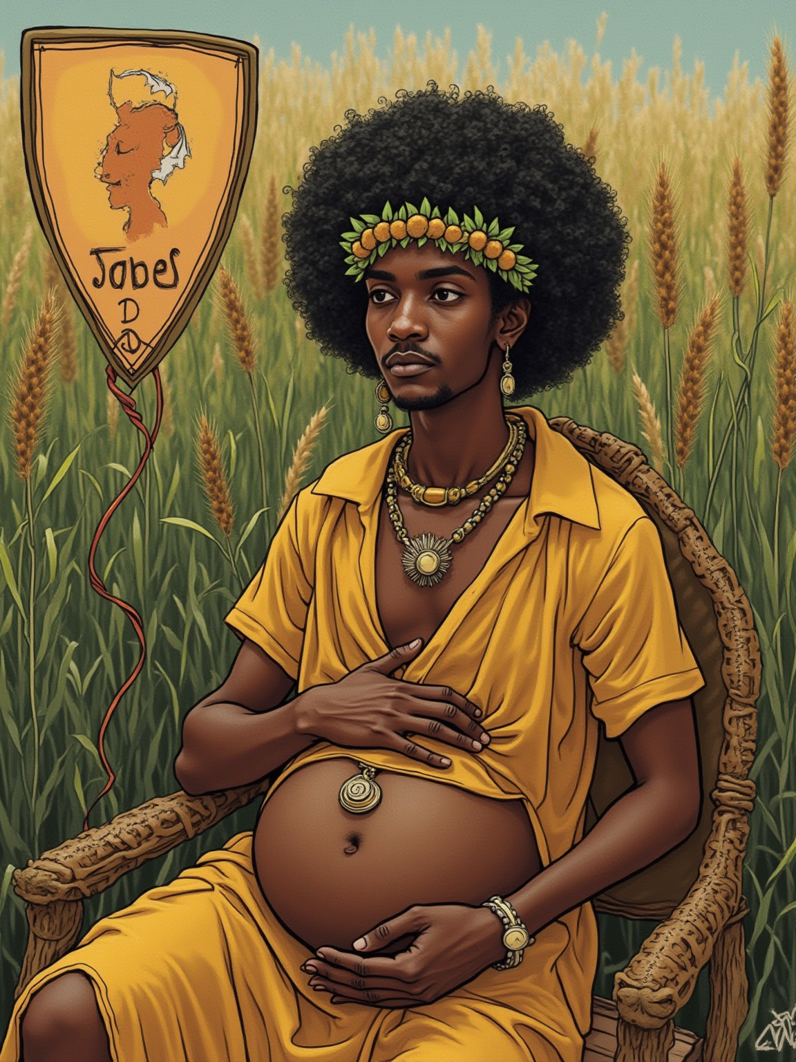 Tarot Card of The Empress featuring model wearing nature-inspired robes with leaf crown and earth-toned jewelry, seated in lush garden setting, wheat field background, Venus symbol on shield, pregnant or nurturing pose, abundant natural beauty