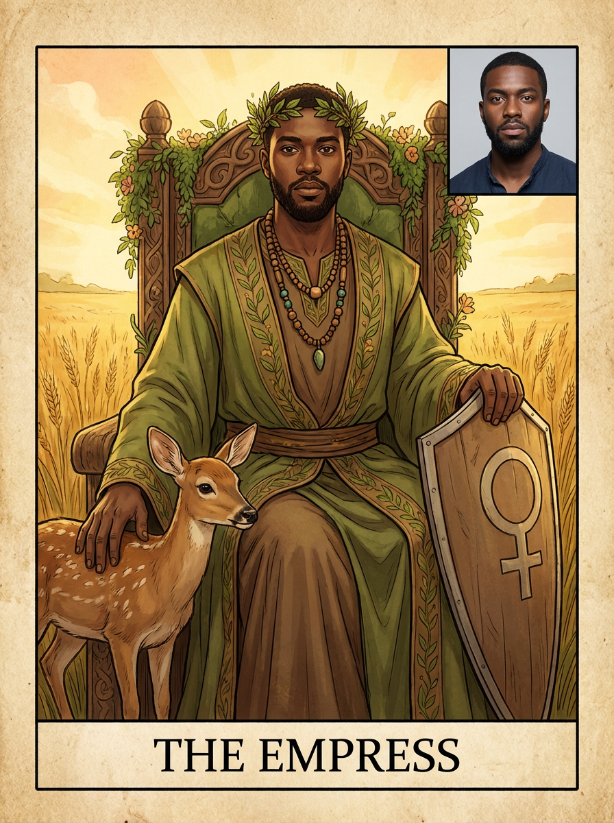 Tarot Card of The Empress featuring model wearing nature-inspired robes with leaf crown and earth-toned jewelry, seated in lush garden setting, wheat field background, Venus symbol on shield, nurturing pose, abundant natural beauty