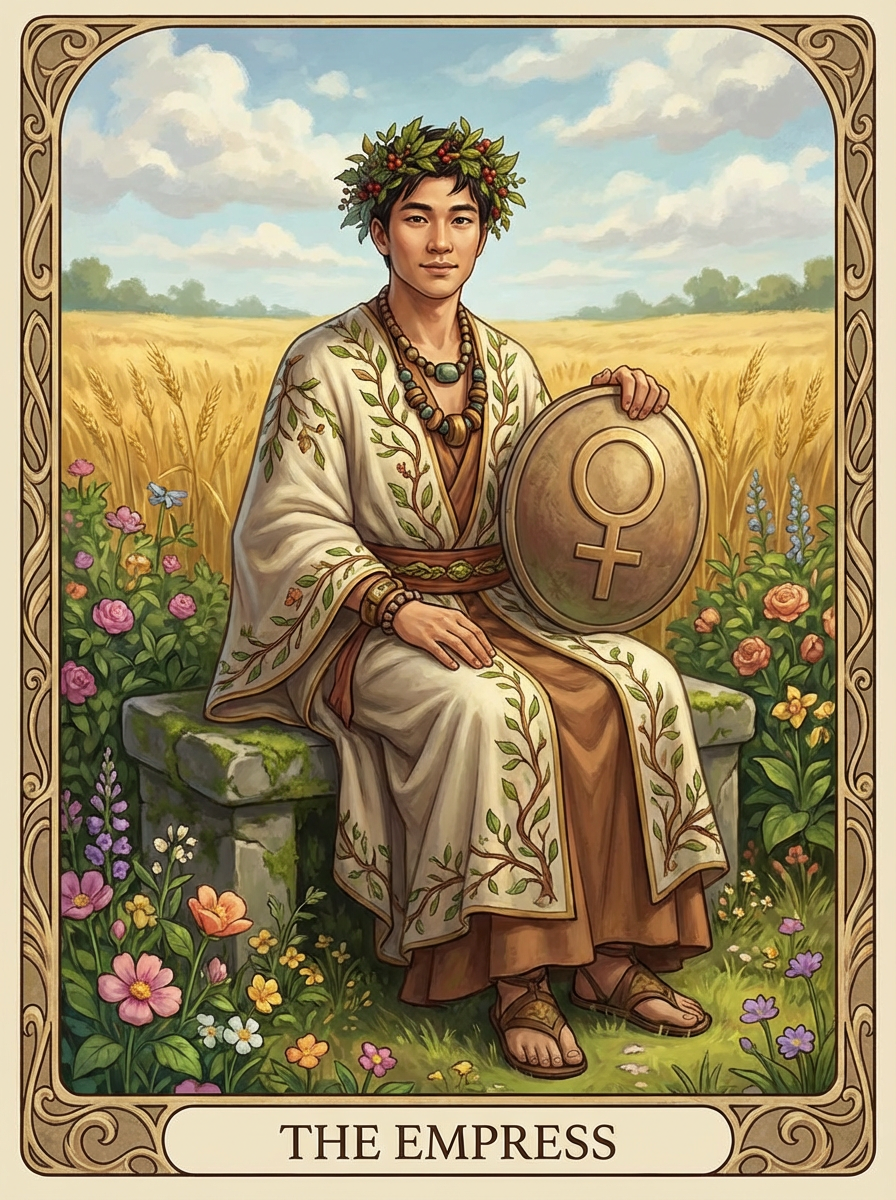 Tarot Card of The Empress featuring model wearing nature-inspired robes with leaf crown and earth-toned jewelry, seated in lush garden setting, wheat field background, Venus symbol on shield, nurturing pose, abundant natural beauty