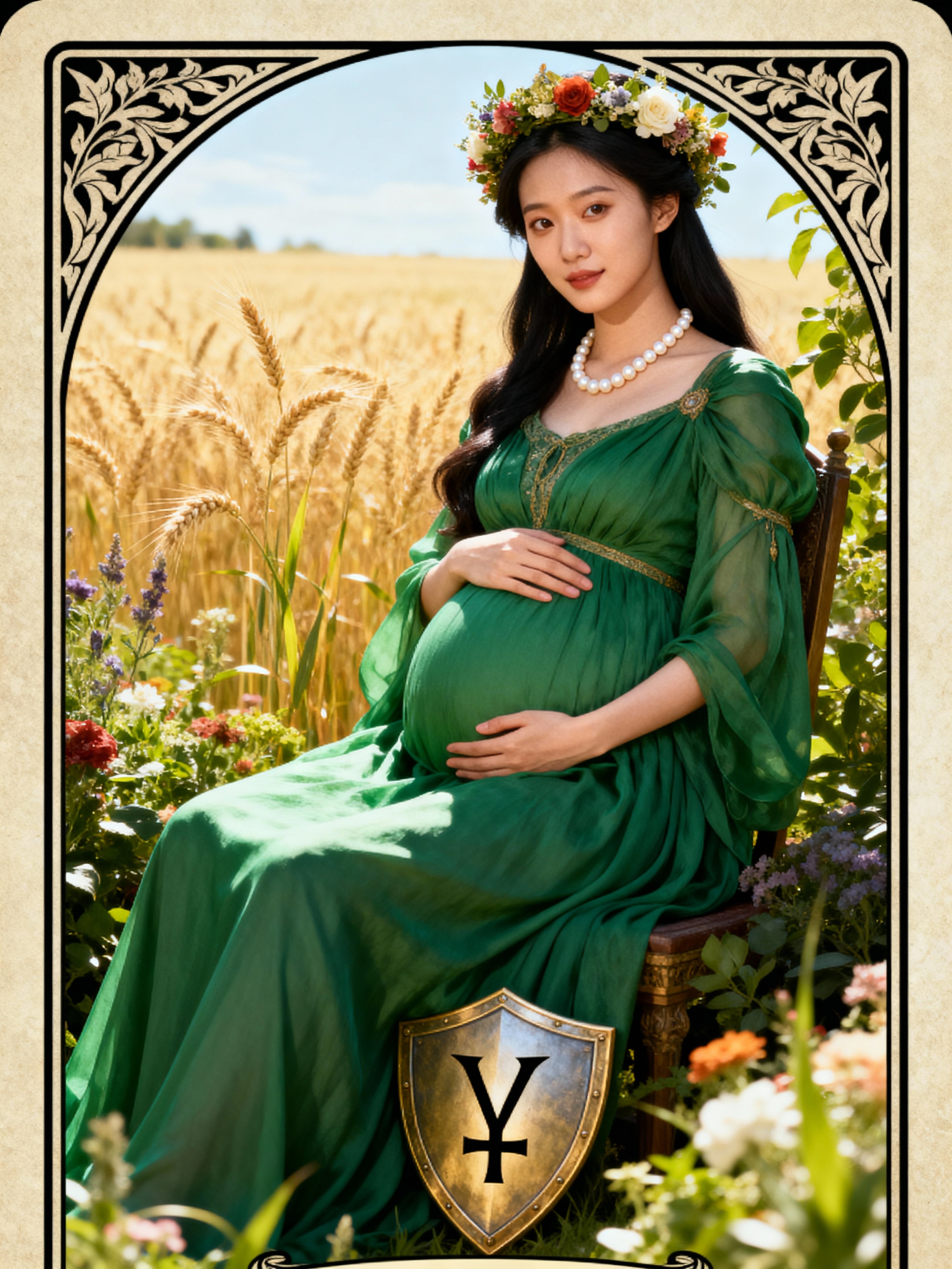 Tarot Card of The Empress featuring model wearing flowing green gown with floral crown and pearl necklace , seated in lush garden setting, wheat field background, Venus symbol on shield, pregnant nurturing pose, abundant natural beauty