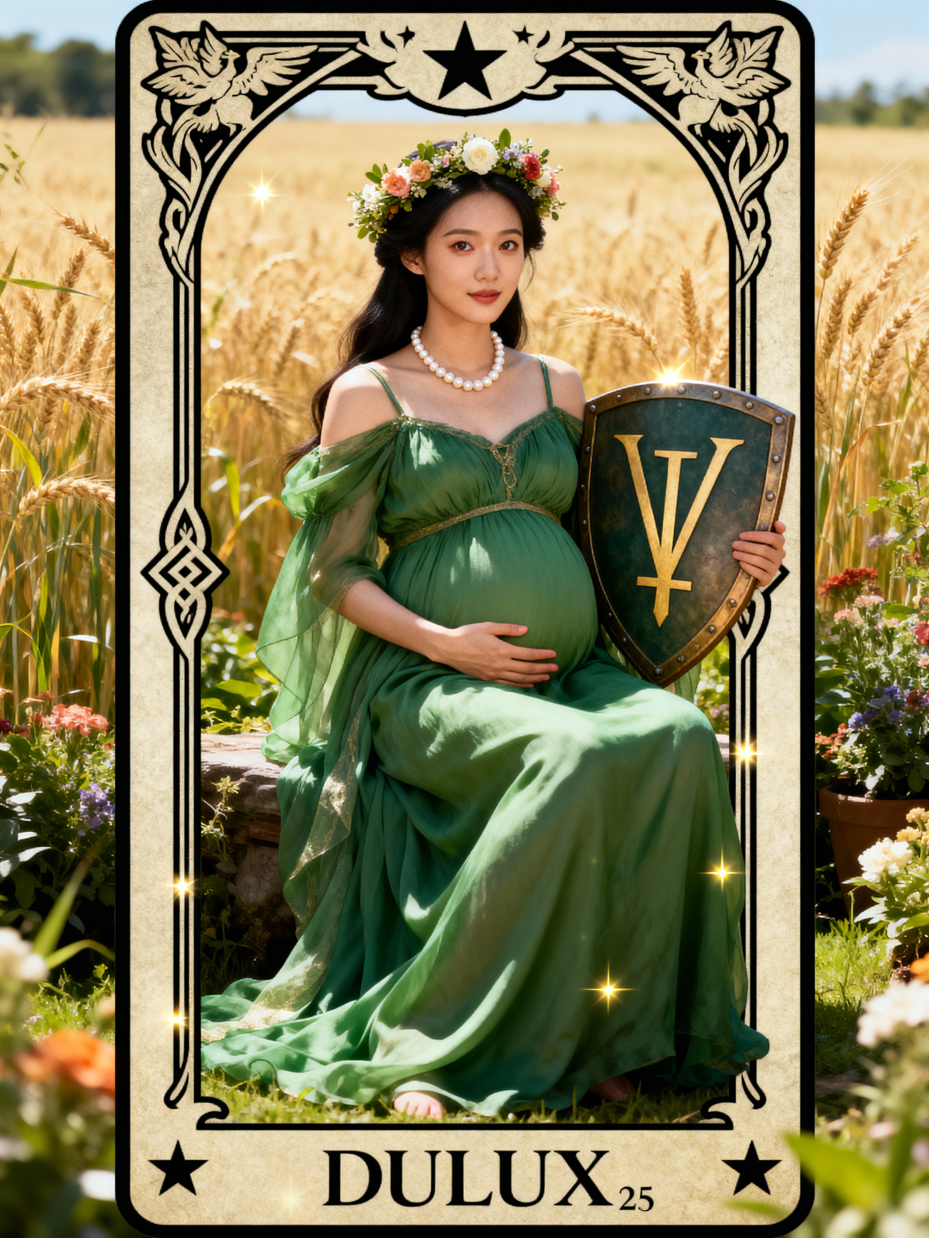 Tarot Card of The Empress featuring model wearing flowing green gown with floral crown and pearl necklace , seated in lush garden setting, wheat field background, Venus symbol on shield, pregnant nurturing pose, abundant natural beauty