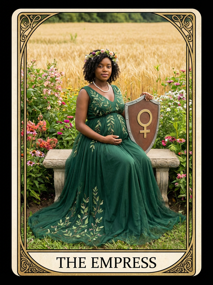 Tarot Card of The Empress featuring model wearing flowing green gown with floral crown and pearl necklace , seated in lush garden setting, wheat field background, Venus symbol on shield, pregnant nurturing pose, abundant natural beauty