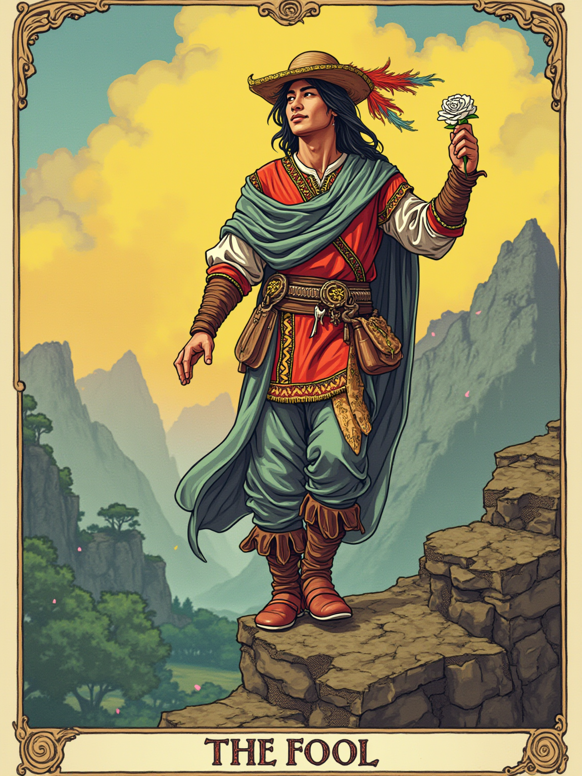 Tarot Card of The Fool featuring model wearing medieval tunic with feathered cap and colorful sash, stepping forward with one foot off a cliff edge, carrying a small bag, white rose in hand, bright mountain landscape background, carefree expression, tarot card illustration style