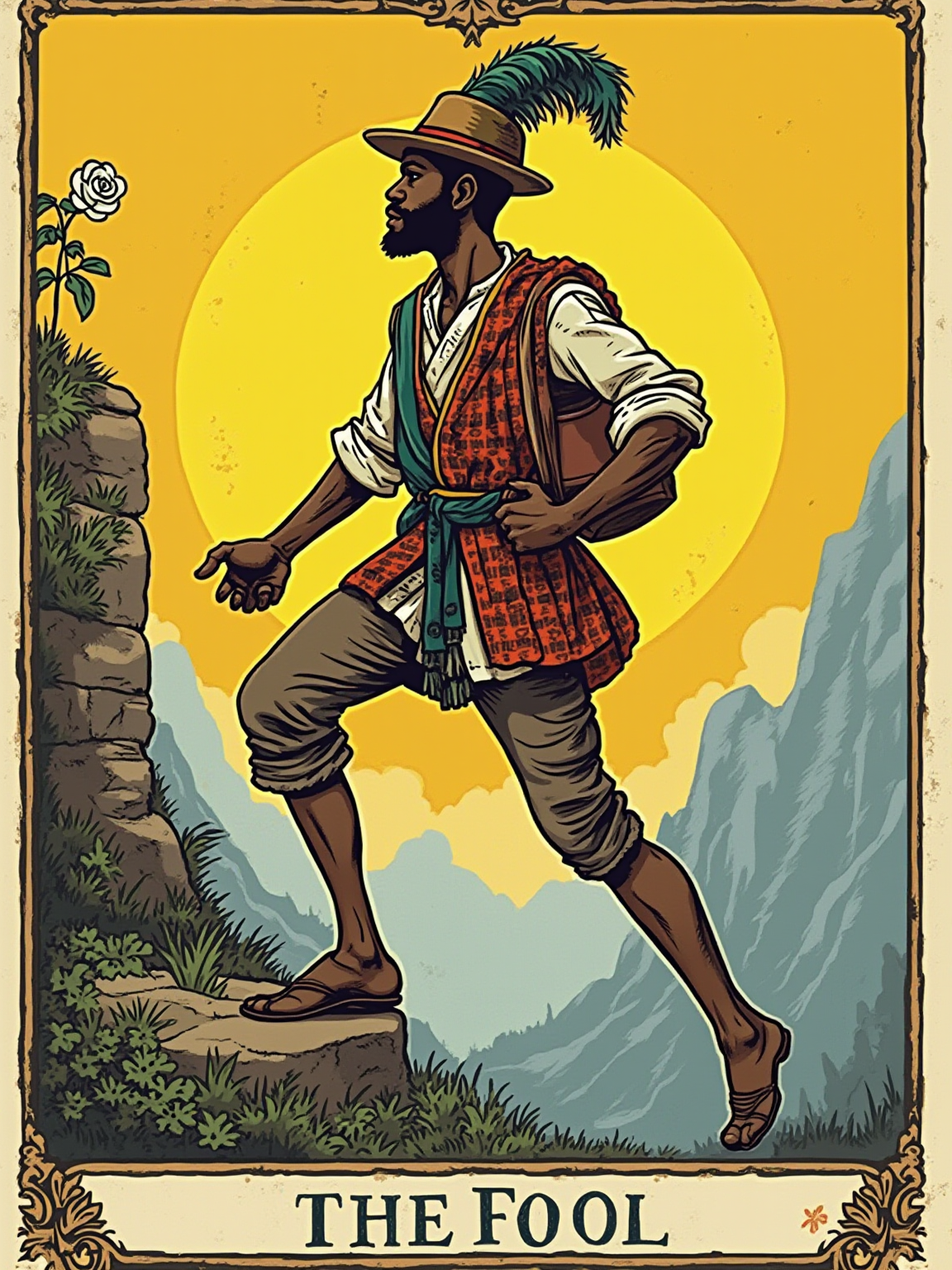 Tarot Card of The Fool featuring model wearing medieval tunic with feathered cap and colorful sash, stepping forward with one foot off a cliff edge, carrying a small bag, white rose in hand, bright mountain landscape background, carefree expression, tarot card illustration style