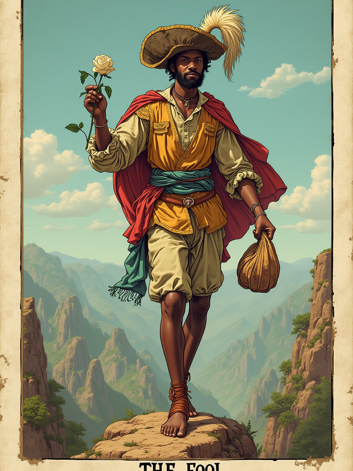 Tarot Card of The Fool featuring model wearing medieval tunic with feathered cap and colorful sash, stepping forward with one foot off a cliff edge, carrying a small bag, white rose in hand, bright mountain landscape background, carefree expression, tarot card illustration style