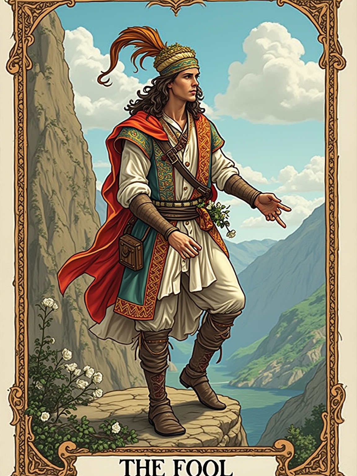Tarot Card of The Fool featuring model wearing medieval tunic with feathered cap and colorful sash, stepping forward with one foot off a cliff edge, carrying a small bag, white rose in hand, bright mountain landscape background, carefree expression, tarot card illustration style