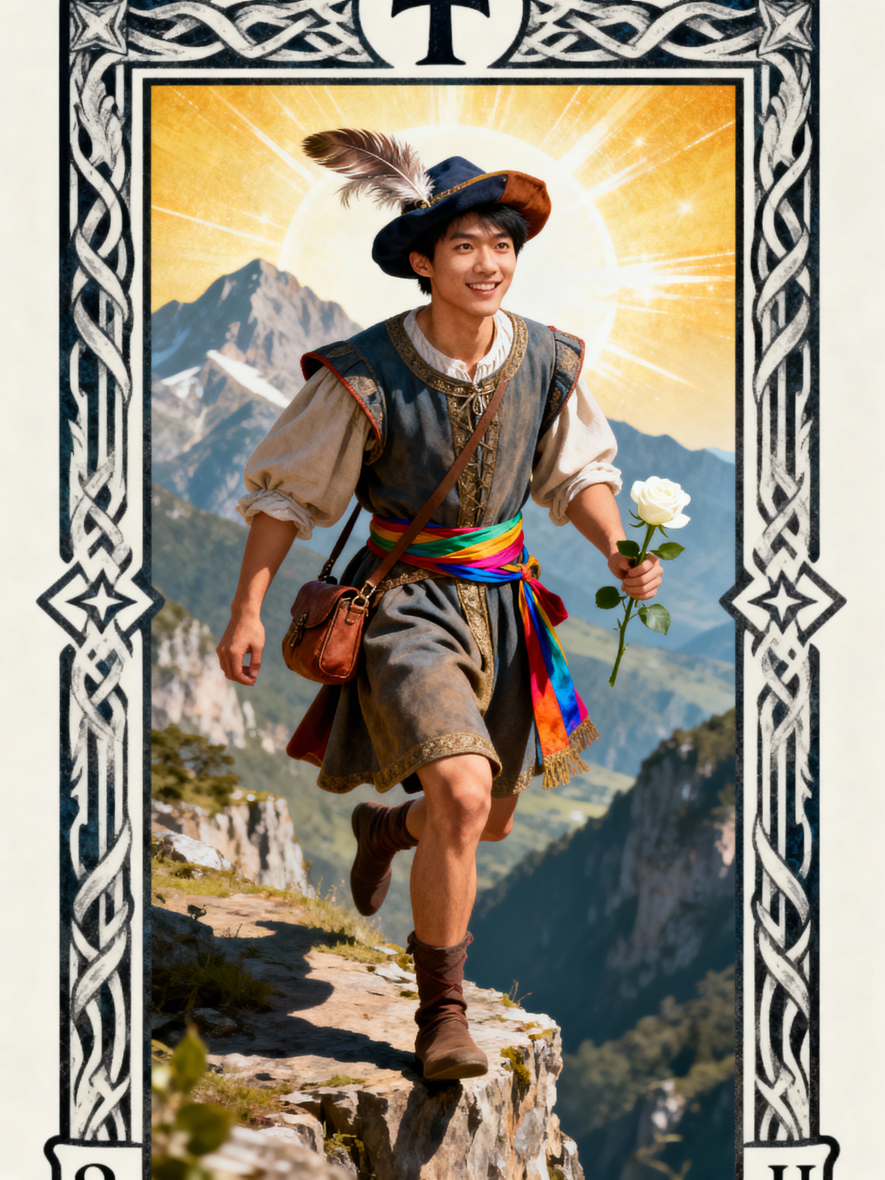Tarot Card of The Fool featuring model wearing medieval tunic with feathered cap and colorful sash, stepping forward with one foot off a cliff edge, carrying a small bag, white rose in hand, bright mountain landscape background, carefree expression, tarot card illustration style