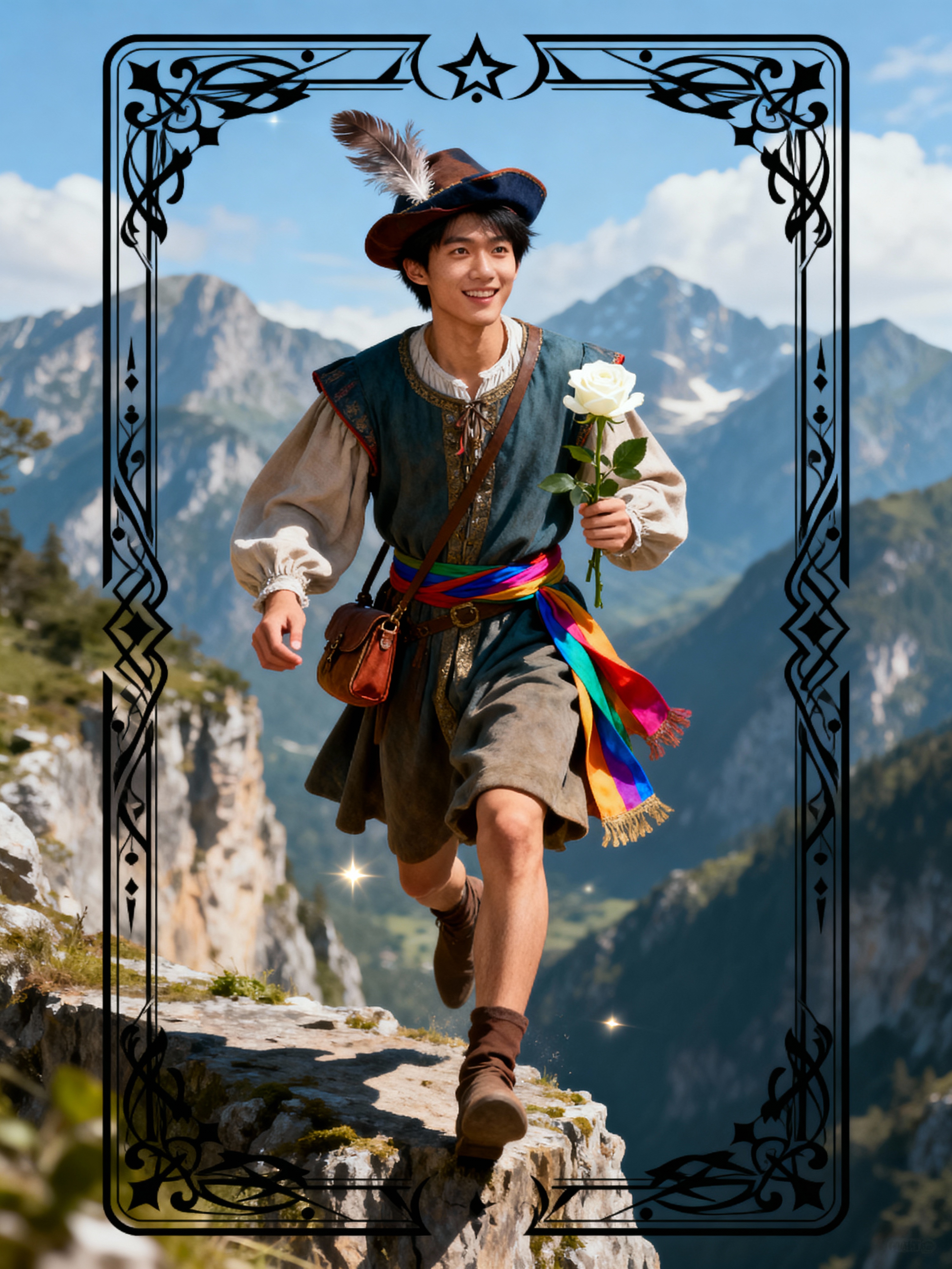 Tarot Card of The Fool featuring model wearing medieval tunic with feathered cap and colorful sash, stepping forward with one foot off a cliff edge, carrying a small bag, white rose in hand, bright mountain landscape background, carefree expression, tarot card illustration style