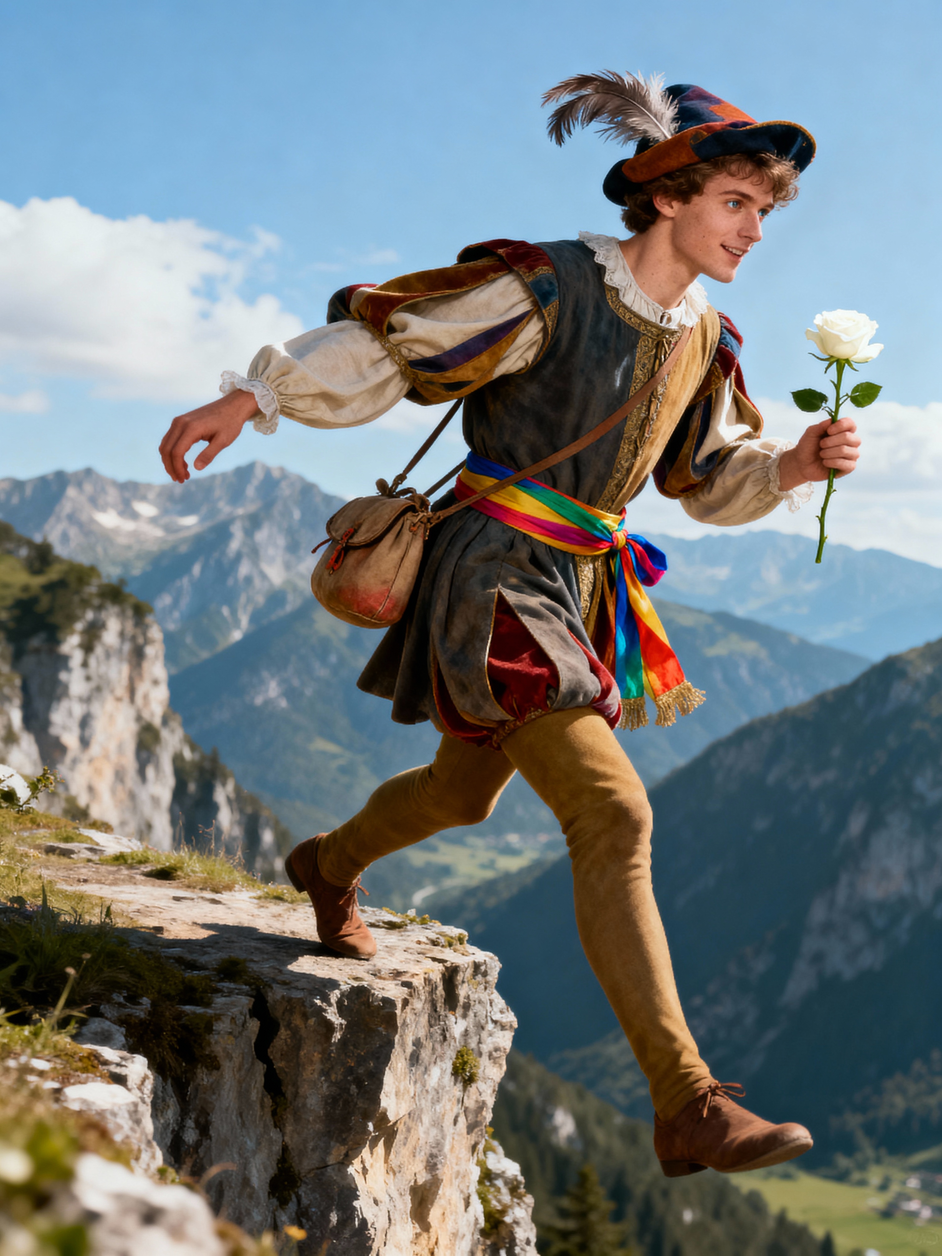 Tarot Card of The Fool featuring model wearing medieval tunic with feathered cap and colorful sash, stepping forward with one foot off a cliff edge, carrying a small bag, white rose in hand, bright mountain landscape background, carefree expression, tarot card illustration style