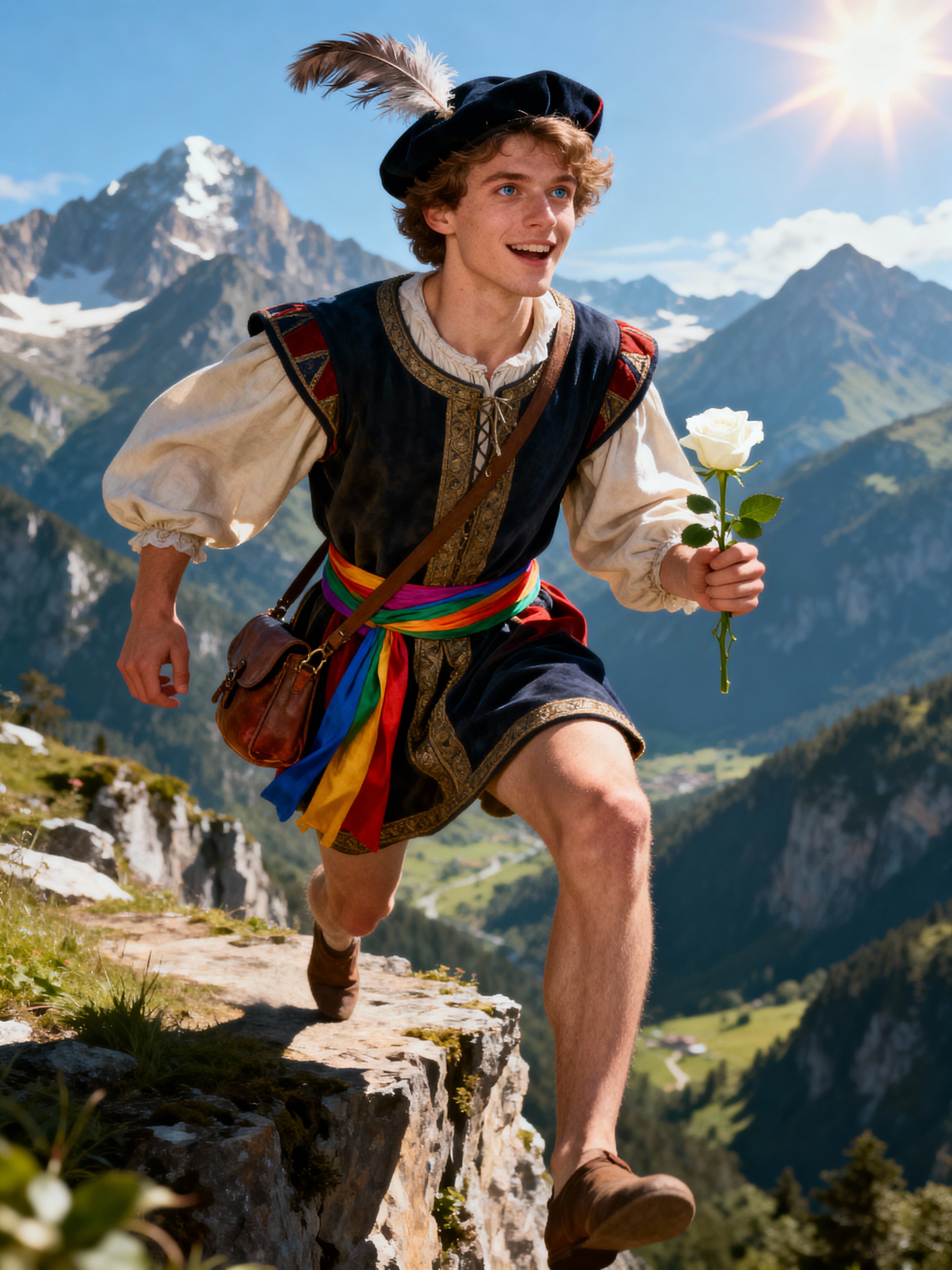 Tarot Card of The Fool featuring model wearing medieval tunic with feathered cap and colorful sash, stepping forward with one foot off a cliff edge, carrying a small bag, white rose in hand, bright mountain landscape background, carefree expression, tarot card illustration style