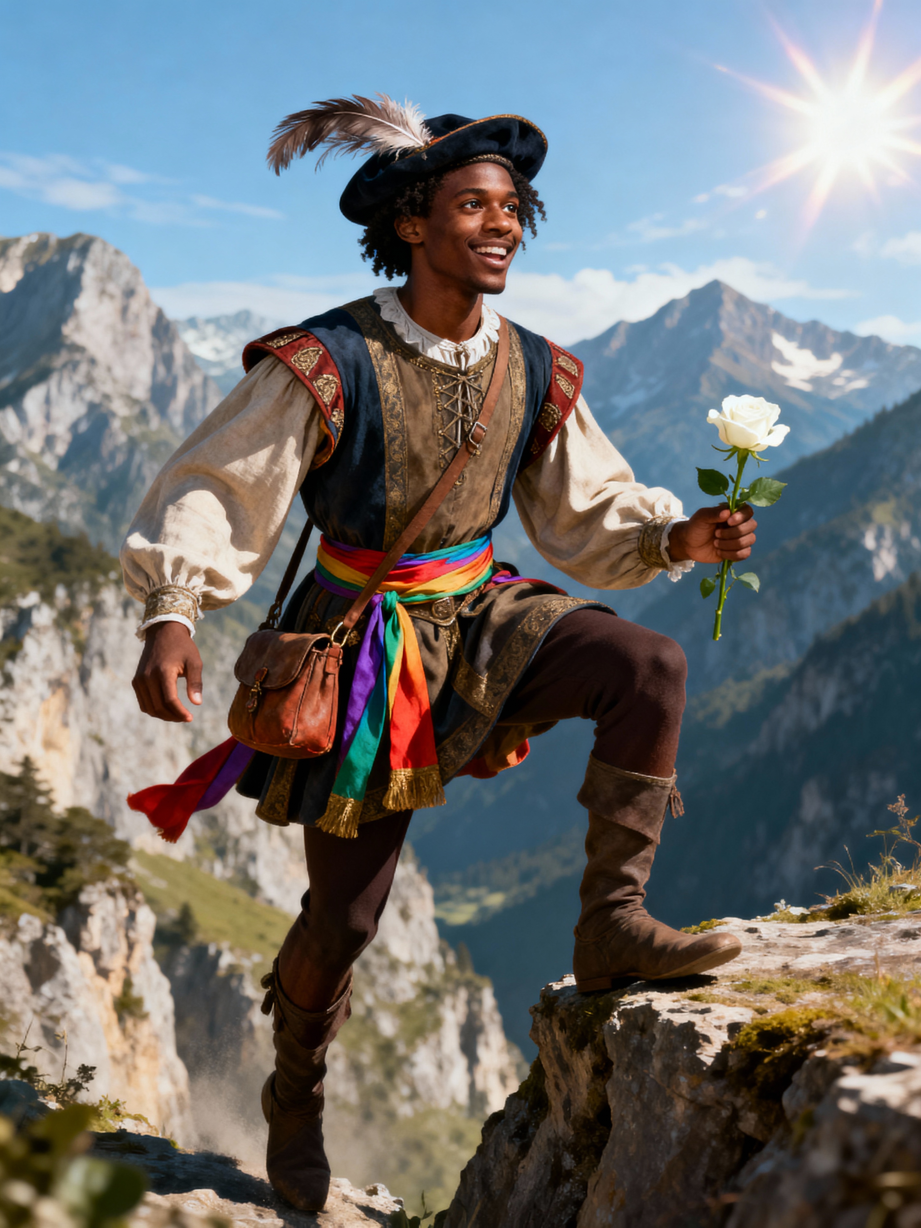 Tarot Card of The Fool featuring model wearing medieval tunic with feathered cap and colorful sash, stepping forward with one foot off a cliff edge, carrying a small bag, white rose in hand, bright mountain landscape background, carefree expression, tarot card illustration style