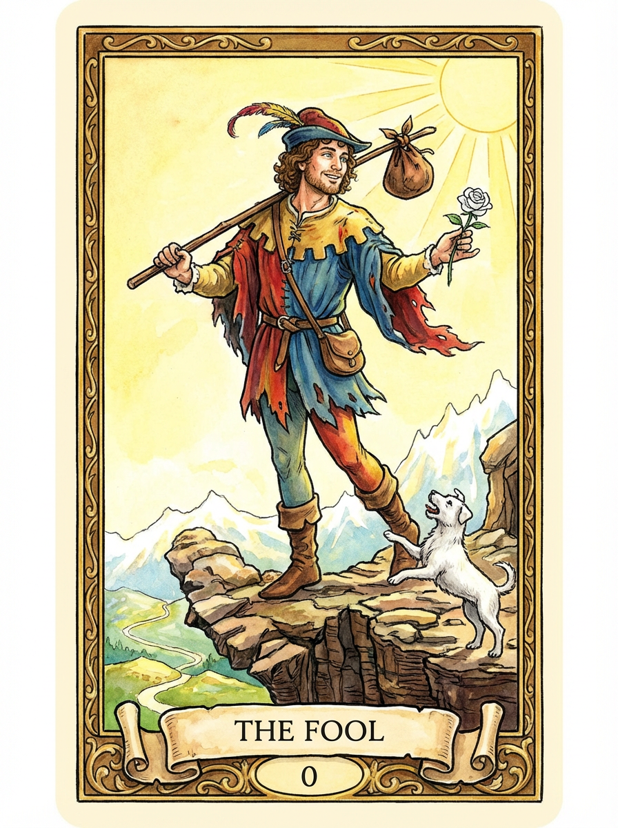 Tarot Card of The Fool featuring model wearing medieval tunic with feathered cap and colorful sash, stepping forward with one foot off a cliff edge, carrying a small bag, white rose in hand, bright mountain landscape background, carefree expression, tarot card illustration style