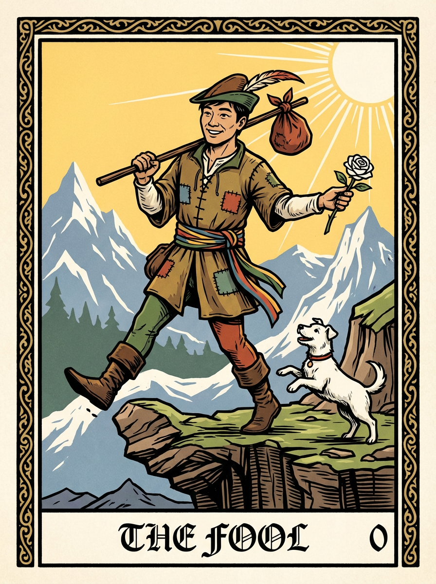 Tarot Card of The Fool featuring model wearing medieval tunic with feathered cap and colorful sash, stepping forward with one foot off a cliff edge, carrying a small bag, white rose in hand, bright mountain landscape background, carefree expression, tarot card illustration style