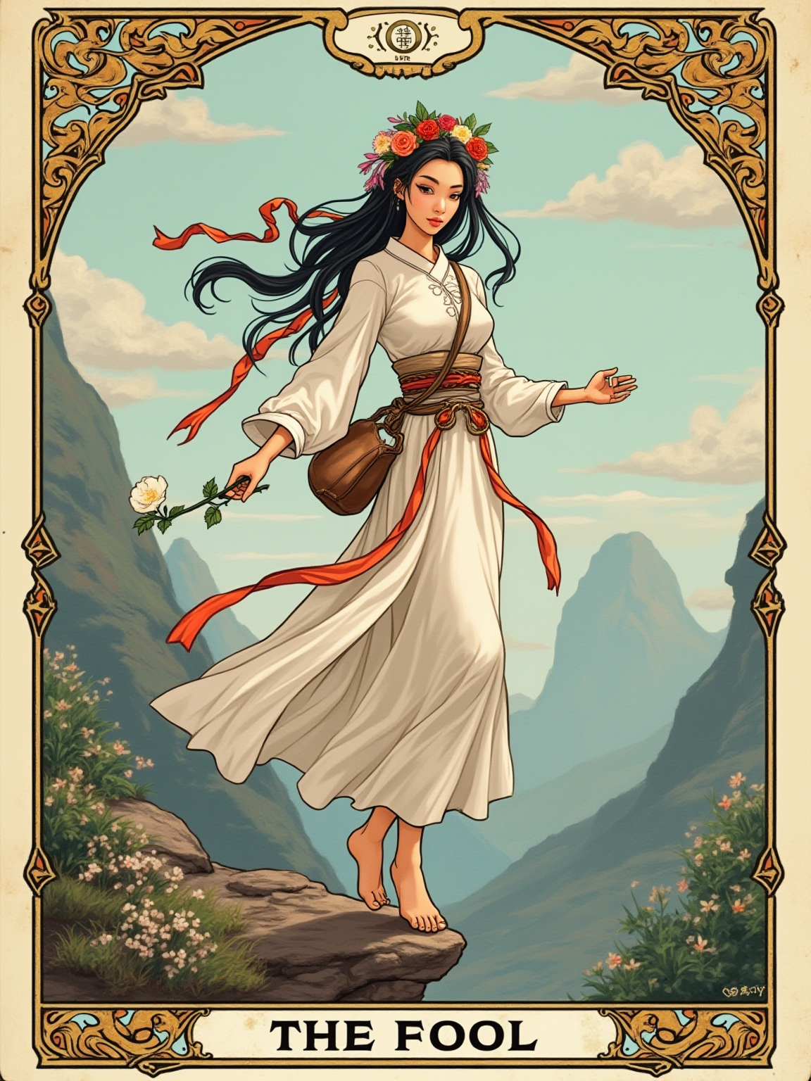 Tarot Card of The Fool featuring model wearing flowing white dress with flower crown and colorful ribbons , stepping forward with one foot off a cliff edge, carrying a small bag, white rose in hand, bright mountain landscape background, carefree expression, tarot card illustration style