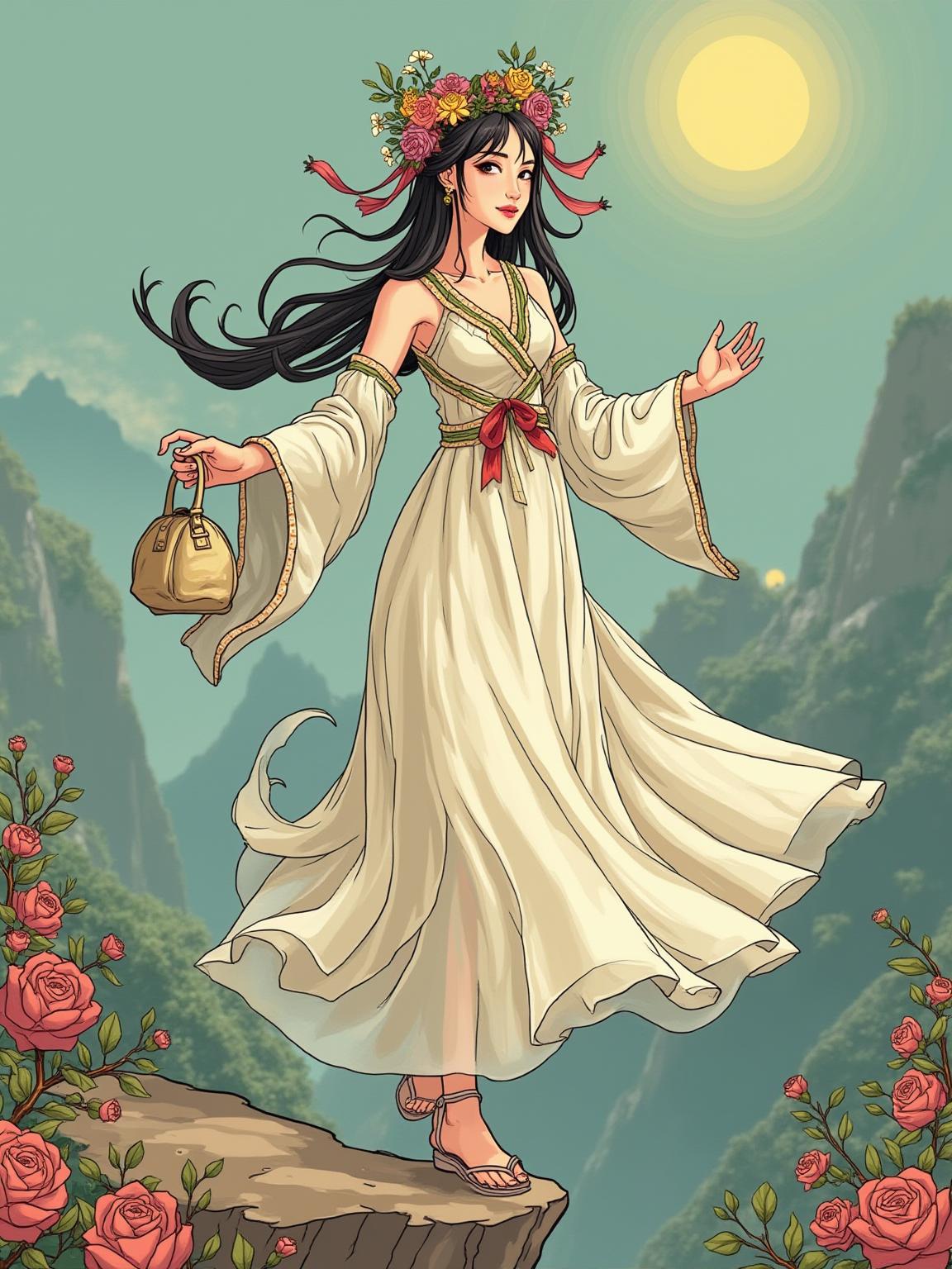 Tarot Card of The Fool featuring model wearing flowing white dress with flower crown and colorful ribbons , stepping forward with one foot off a cliff edge, carrying a small bag, white rose in hand, bright mountain landscape background, carefree expression, tarot card illustration style