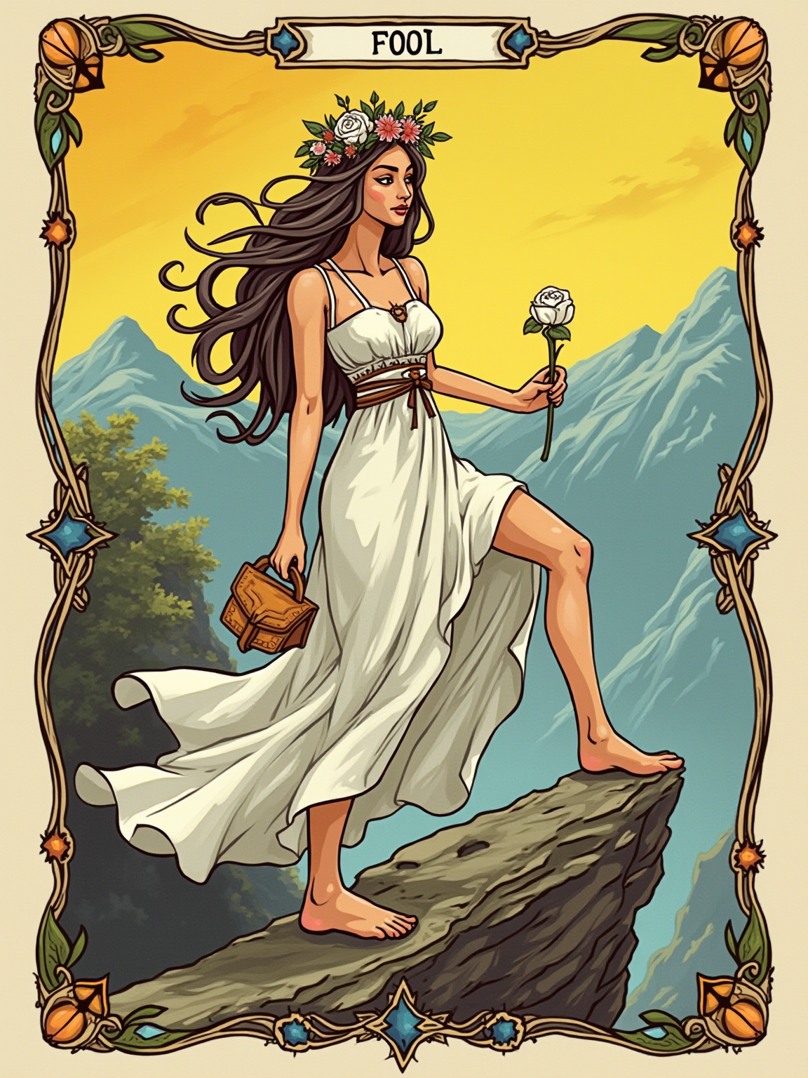 Tarot Card of The Fool featuring model wearing flowing white dress with flower crown and colorful ribbons , stepping forward with one foot off a cliff edge, carrying a small bag, white rose in hand, bright mountain landscape background, carefree expression, tarot card illustration style