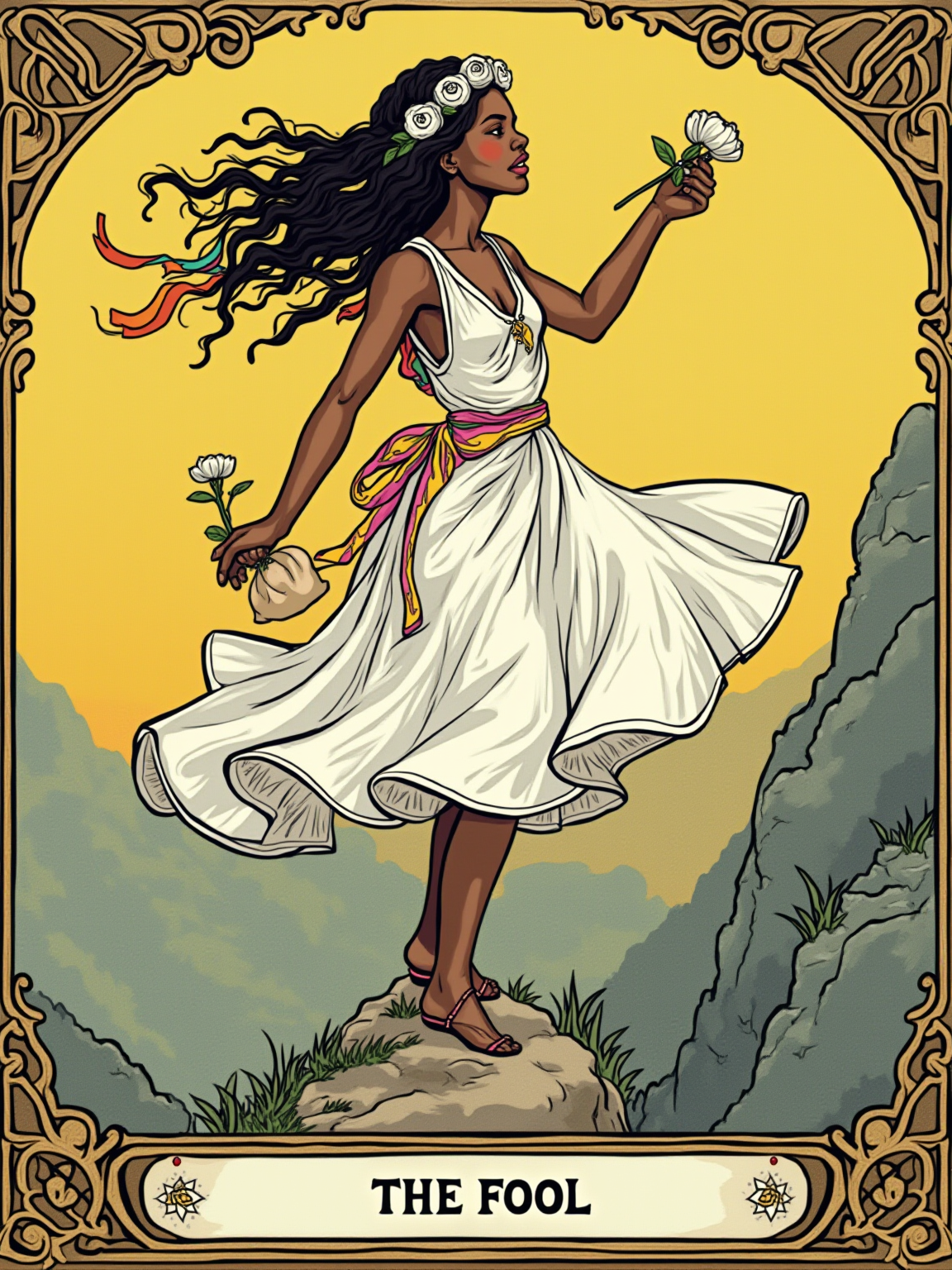 Tarot Card of The Fool featuring model wearing flowing white dress with flower crown and colorful ribbons , stepping forward with one foot off a cliff edge, carrying a small bag, white rose in hand, bright mountain landscape background, carefree expression, tarot card illustration style