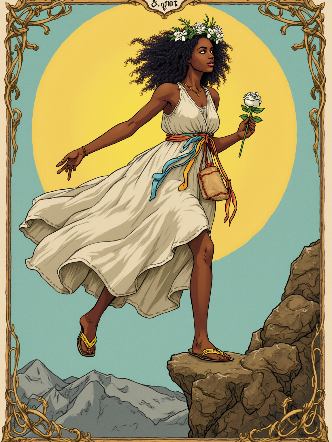 Tarot Card of The Fool featuring model wearing flowing white dress with flower crown and colorful ribbons , stepping forward with one foot off a cliff edge, carrying a small bag, white rose in hand, bright mountain landscape background, carefree expression, tarot card illustration style