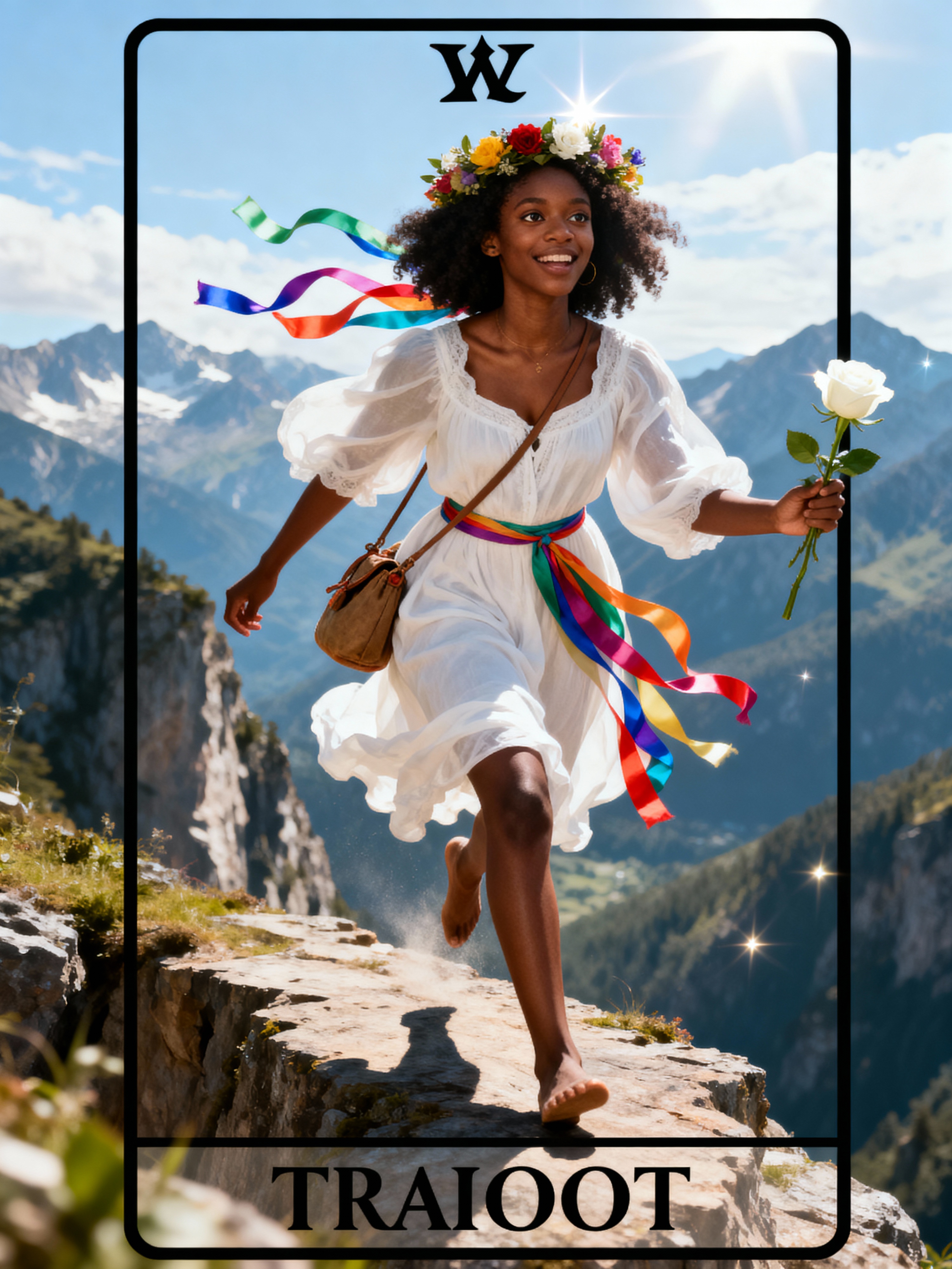 Tarot Card of The Fool featuring model wearing flowing white dress with flower crown and colorful ribbons , stepping forward with one foot off a cliff edge, carrying a small bag, white rose in hand, bright mountain landscape background, carefree expression, tarot card illustration style